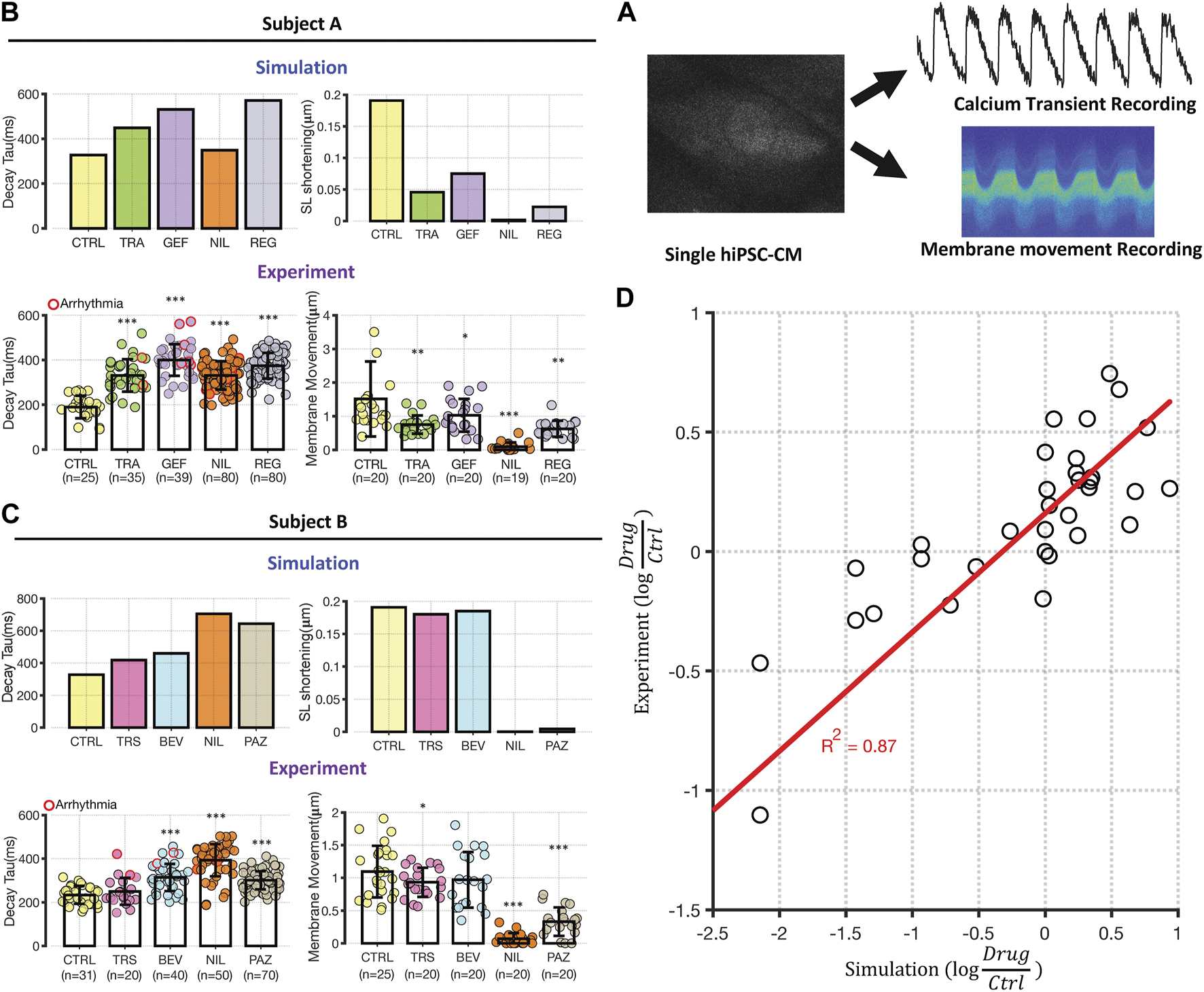 Experimental testing of transcriptomic based simulation predictions. (A) Schematic illustrating that iPSC-CMs were loaded with either fluo3 or FluoVolt for CaT or membrane movement recordings, respectively. Metrics were extracted from fluorescence time course measurements for comparison with simulation results. (B, C) Comparison between simulations of Decay Tau (left bar graphs) and SL shortening (right bar graphs) in the two cell lines. Simulation results for control conditions and four drugs in each cell line are shown above experimental results under the same conditions. Results from Cell Lines A and B are displayed in panels (B) and (C), respectively. Error bars indicate standard deviation, and asterisks indicate significantly different from control, based on two sample, unpaired t-test (*p < 0.05, **p < 0.01 and ***p < 0.001). The number of experimental samples in each group is provided beneath the experimental bar graphs. (D) Direct comparison of modeling predictions (abscissa) with experimental data (ordinate), with each expressed as the logarithm of the change in drug-treated relative to vehicle-treated iPSC-CMs. Each dot represents a change in a time course metric (Decay Tau, CaT triangulation, CaT AUC, and SL shortening) caused by changes in gene expression induced by a particular drugs. Results from Cell Lines A and B are grouped together, and the calculated R2 of 0.87 includes 3 data points that induce extreme changes to metrics and are not visible on this scale.
