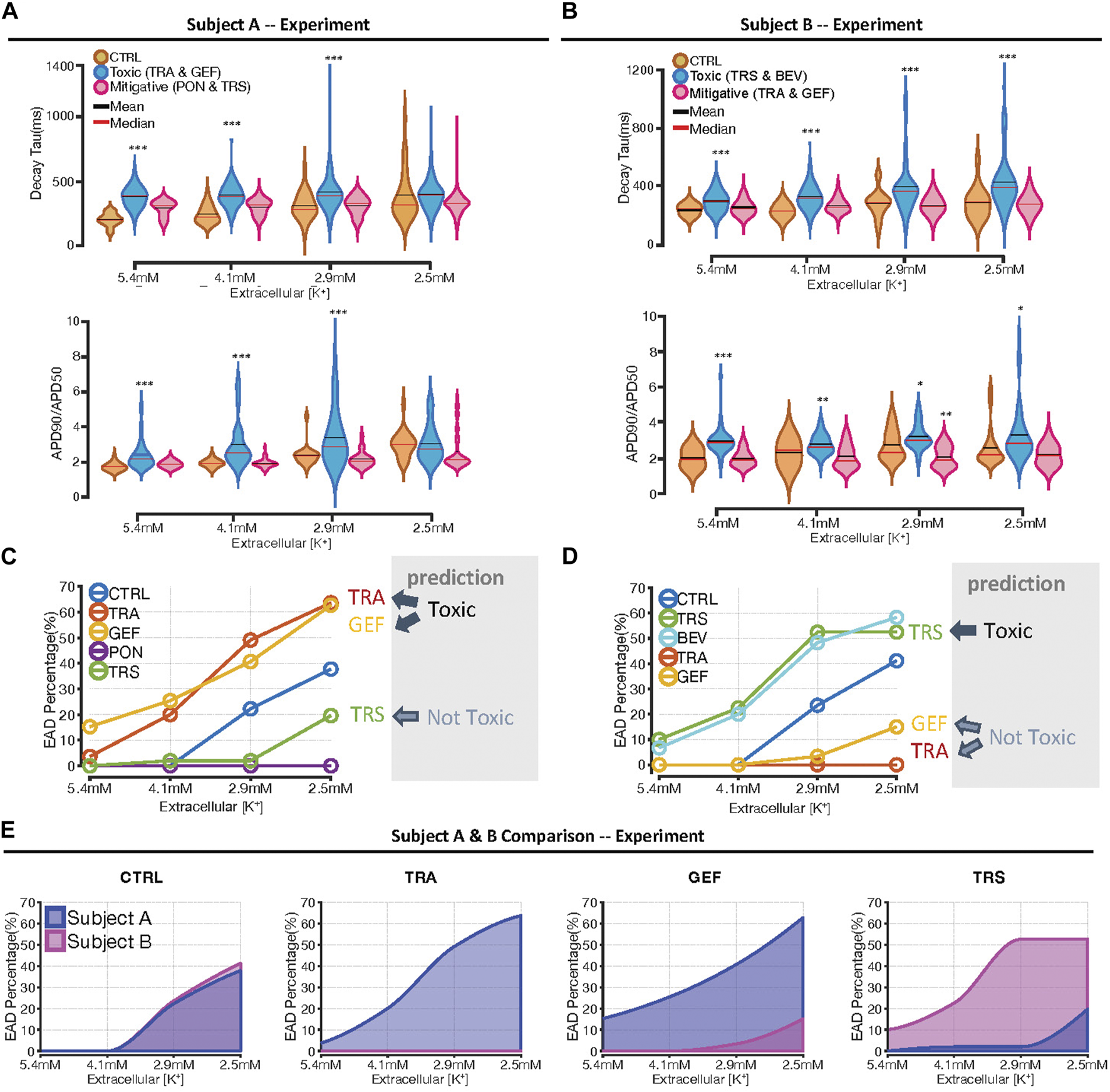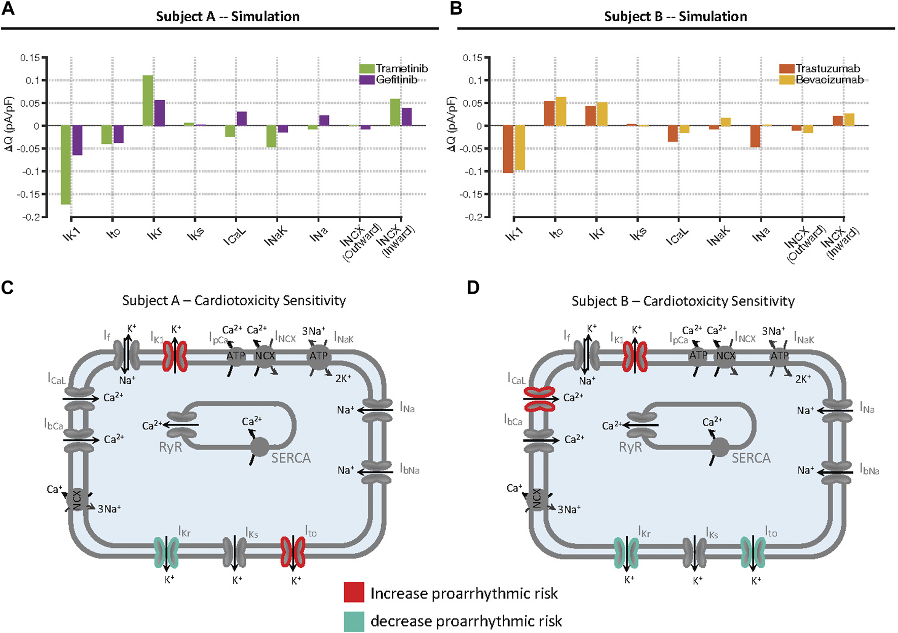 Results: Experimental recordings of action potentials, intracellular calcium, and contraction in iPSC-CMs demonstrated that modeling predictions were accurate, with 81% of modeling predictions across the two cell lines confirmed experimentally. Surprisingly, simulations of how TKI-treated iPSC-CMs would respond to an additional arrhythmogenic insult, namely, hypokalemia, predicted dramatic differences between cell lines in how drugs affected arrhythmia susceptibility, and these predictions were confirmed experimentally. Computational analysis revealed that differences between cell lines in the upregulation or downregulation of particular ion channels could explain how TKI-treated cells responded differently to hypokalemia.