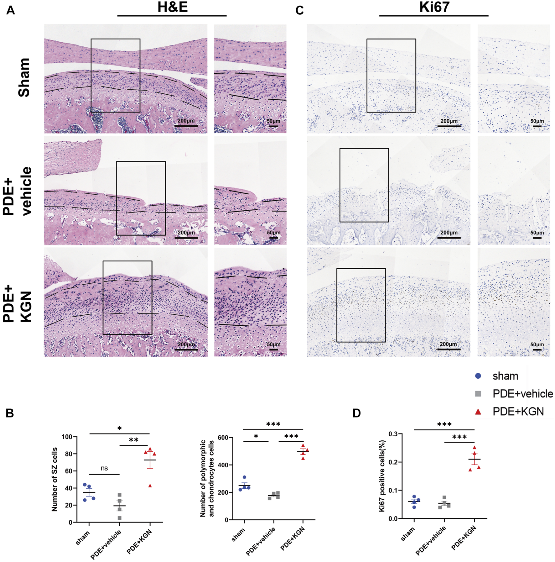 Next, we investigated the effect of KGN treatment on the proliferation of condylar chondrocytes by counting the number of nuclei in the superficial zone (SZ), polymorphic, and chondrocyte layers of condylar cartilage via HE staining (Figure 2A). Although the number of nuclei in the SZ layers of vehicle-treated rats was slightly lower than that in the sham-operated group, the number of nuclei in the polymorphic and chondrocyte layers was significantly decreased. Meanwhile, the numbers of nuclei in the SZ, polymorphic, and chondrocyte layers of KGN-treated rats were significantly higher than those in the sham-operated and vehicle-treated groups (Figure 2B). The hypertrophic chondrocyte layer in the KGN-treated group was clearly thicker than that in the vehicle-treated and sham-operated groups when viewed under a microscope. Based on these findings, KGN treatment may promote FCSC proliferation and chondrogenic differentiation in the SZ layer under TMJOA, which in turn increases the number of cells in the polymorphic and chondrocyte layers, thereby promoting the thickening of articular cartilage. IHC was used to analyze the expression of Ki67 in TMJ condylar cartilage so as to determine whether KGN treatment promoted cell proliferation in vivo (Figure 2C). Our results showed that, while the expression of proliferation marker Ki67 was slightly reduced in the vehicle-treated group compared to that in the sham-operated group, it was significantly upregulated in the KGN-treated group compared to both the sham-operated and vehicle-treated groups (Figure 2D). These findings implied that KGN therapy promoted condylar chondrocyte proliferation.