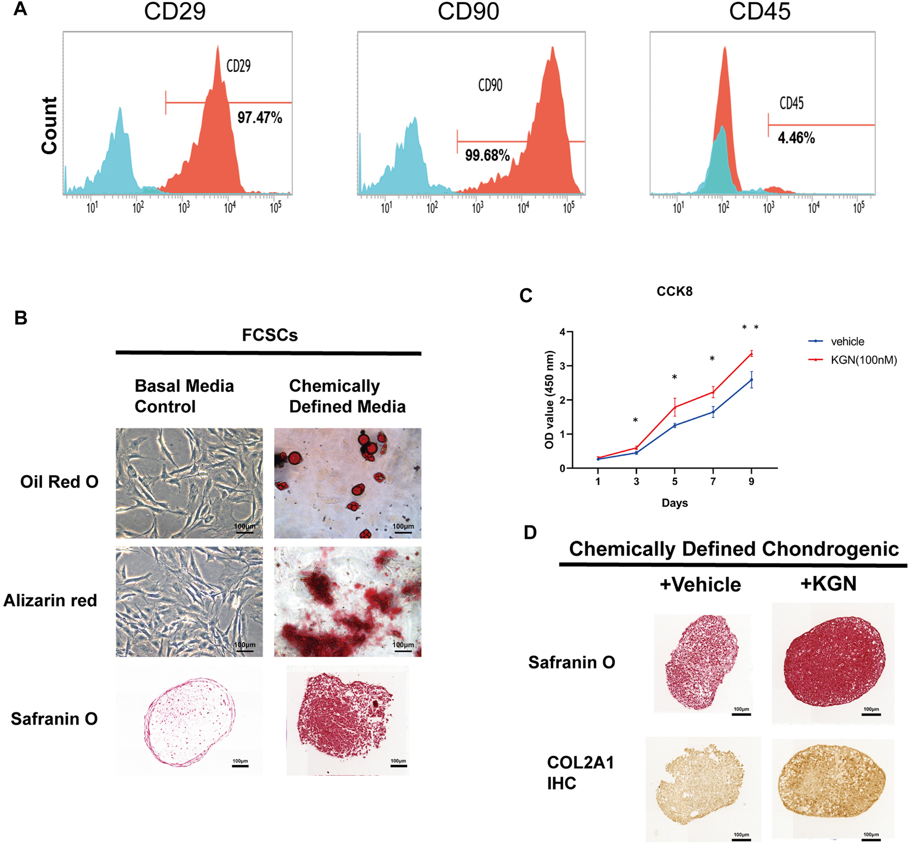 We further determined whether KGN treatment could promote the proliferation and differentiation of FCSCs in vitro. FCSCs were isolated from the condylar surface of rats, and their capacity for multilineage differentiation was examined in vitro. Expression of stem cell surface markers in FCSCs was determined by flow cytometry analysis. The result shown that FCSCs were positive for CD29 and CD90, while negative for CD45 (Figure 3A). This result was consistent with previous finding in rat FCSCs (Embree et al, 2016). Adipogenesis (Oil Red O-positive), mineralization (Alizarin red-positive), and chondrogenesis (Safranin O-positive) were observed in pellet cultures, which indicates that isolated FCSCs can differentiate into multiple lineages (Figure 3B). The CCK8 assay was then used to assess FCSCs proliferation following KGN treatment. Our findings showed that KGN treatment for 1, 3, 5, 7, and 9 days considerably enhanced the proliferation of FCSCs (Figure 3C). A pellet culture system was used to evaluate whether KGN treatment induced FCSC chondrogenesis. Histological analysis using Safranin O staining revealed that the KGN-treated group had greater staining intensity than the control group. Further IHC evaluation also revealed the KGN-treated group had increased type II collagen expression (Figure 3D). These findings demonstrate that KGN treatment promotes FCSCs proliferation and cartilaginous-like tissue formation in vitro.