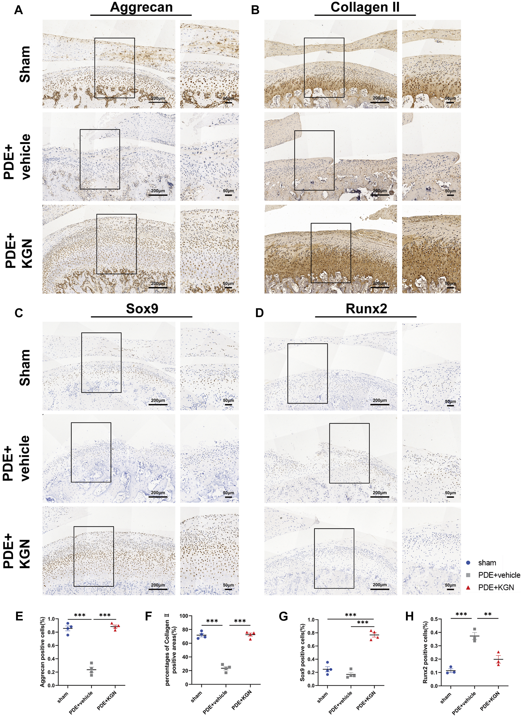 Kartogenin upregulated cartilage anabolic factors while suppressing catabolic factor expression after PDE surgery in rats. IHC staining of Aggrecan (A), Collagen II (B), Sox9 (C), and Runx2 (D) of the rat TMJ condyle cartilage and quantitative analysis (E,F,G, H) of immuno-positive cells or areas of the sham-operated, vehicle-treated, and KGN-treated groups. n = 4 for Aggrecan, Collagen II, and Sox9; n = 3 for Runx2. Scale bars = 200 μm (left) and 50 μm (right). Values are presented as the mean ± SD; *p < 0.05, **p < 0.01, and ***p < 0.001 between groups indicated by lines.