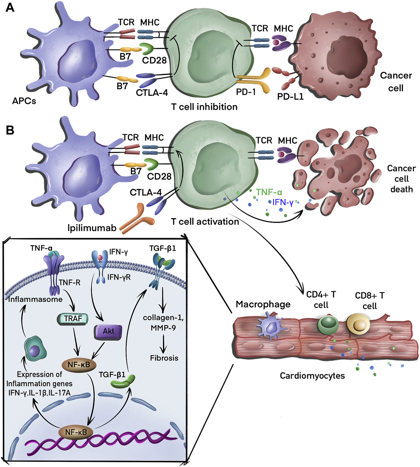 Molecular mechanisms of tumor evasion and cardiotoxicity induced by CTLA-4 blockade. (A) T cells recognize major histocompatibility complex (MHC) molecules on antigen presenting cells (APC), leading to the activation of these T cells, which then migrate to the tumor bed where they recognize cancer cells via the interaction between the MHC complex and T cell receptors (TCR) on the T cell. T cells receive inhibitory signals induced by the binding of CTLA-4 to B7 and PD-1 to PD-L1. (B) CTLA-4 inhibitor (ipilimumab) binds to CTLA-4 to activate T cells that eliminate tumor cell by secreting interferon-γ (IFN-γ) and tumor necrosis factor-alpha (TNF-α). CD4+ and CD8+ T cells also infiltrate the myocardial tissue, releasing TNF-α, which induces the production of proinflammatory cytokines, including IFN-γ, interleukin (IL)-2, and IL-17A via the activation of the nuclear factor-kappa B (NF-κB) signaling pathway. IFN-γ can also induce fibrosis by promoting the expression of transforming growth factor-beta 1 (TGF-β1).