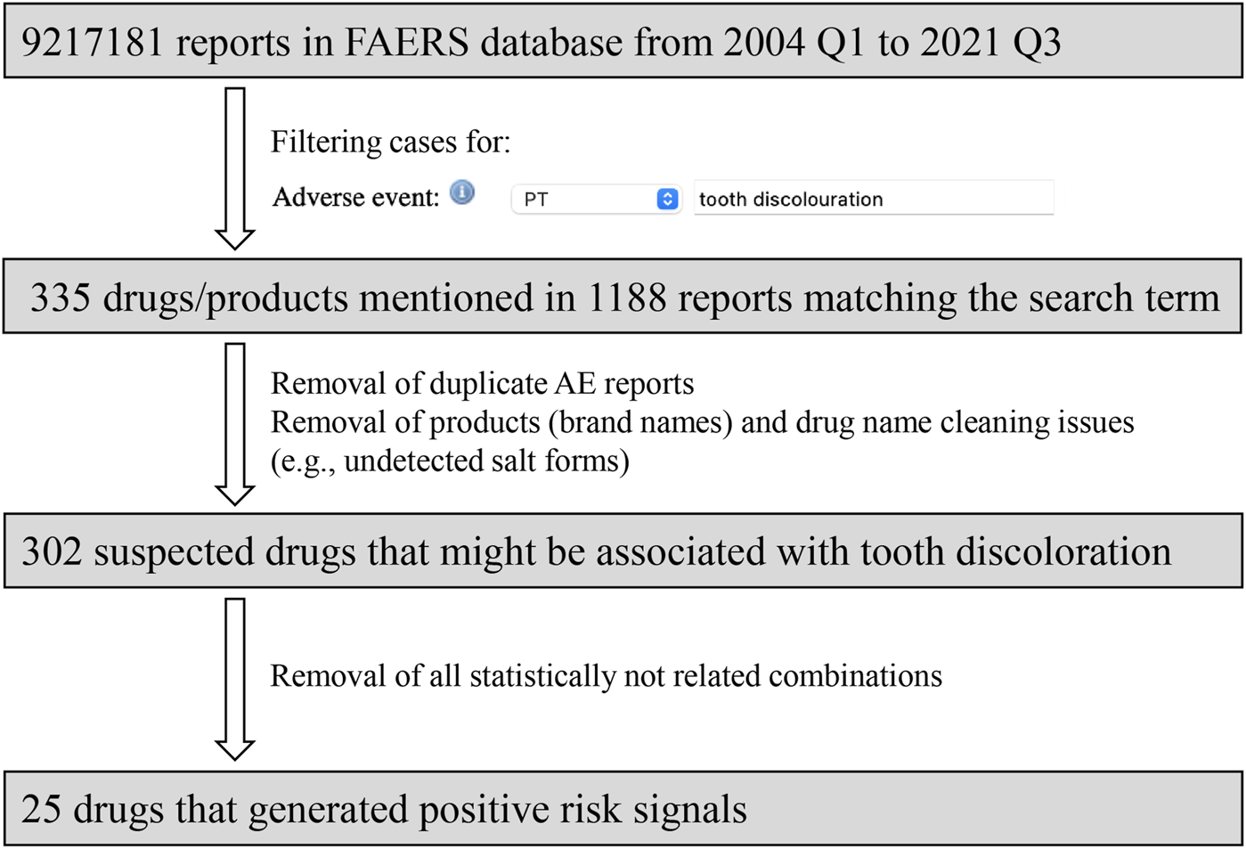 Methods: An observational, retrospective, and pharmacovigilance analysis was conducted, in which we extracted adverse event (AE) reports involving tooth discoloration by using the data of the US Food and Drug Administration’s Adverse Event Reporting System (FAERS) from the first quarter (Q1) of 2004 to the third quarter (Q3) of 2021. Disproportionality analyses were performed to examine risk signals for tooth discoloration and determine the drugs inducing tooth discoloration.