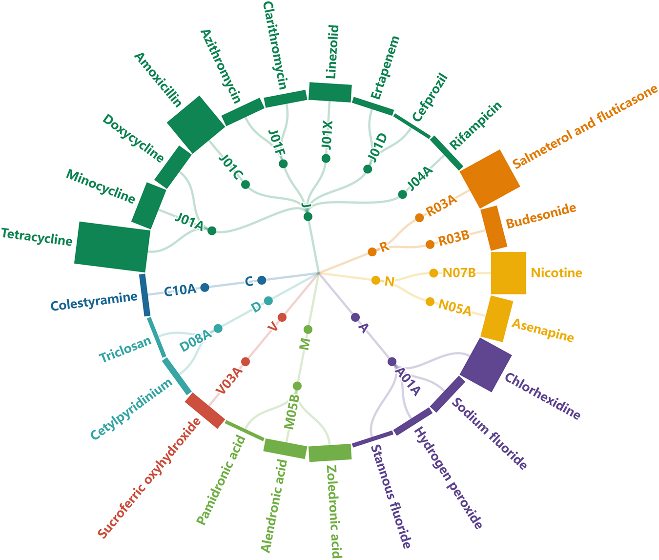 FIGURE 2. Radical tree of drugs grouped by ATC class. The height of each column represents the number of submitted AE reports (J: anti-infectives for systemic use, R: respiratory system, N: nervous system, A: alimentary tract and metabolism, M: musculo-skeletal system, V: various, D: dermatologicals, C: cardiovascular system).