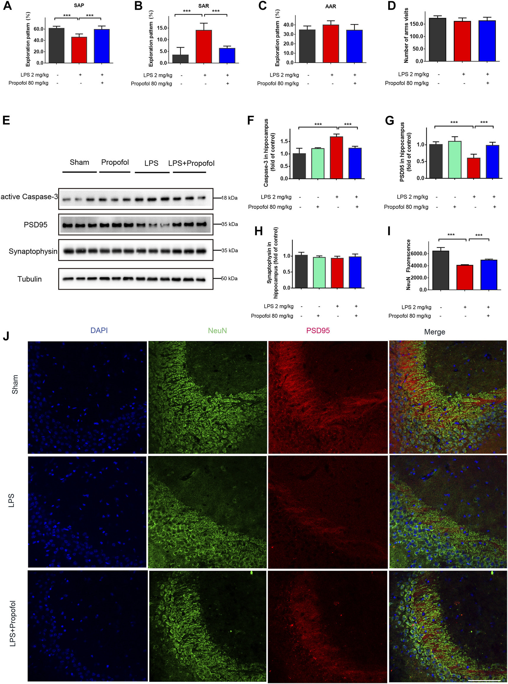 Propofol inhibits lipopolysaccharide-induced hippocampal injury and cognitive deficit in vivo. The animals were subjected to Y-maze to test spatial working memory at 24 h after Intraperitoneal injection of lipopolysaccharide. (A–D) Propofol improved SAP, and reduced SAR. SAP is defined as the percentage of triads that an animal goes into three different arms of the Y-maze in a triad entry; AAR as the percentage of an animal goes into alternative arms in a triad entry, and SAR as the percentage of an animal returns to the same arm in any consecutive entries in a triad entry. (E–H) Western blot analysis showed that propofol significant decreased the expression of active Caspase-3, PSD95 at 4 hours after intraperitoneal injection of lipopolysaccharide. (I, J) The Immunofluorescence staining (scale bar below: 25 μm) showed DAPI (blue), PSD95 (red), colocalized (merged) with NeuN (green). The data are expressed as means ± SD (n = 6-8 animals); ***p < 0.001 for comparisons as shown.