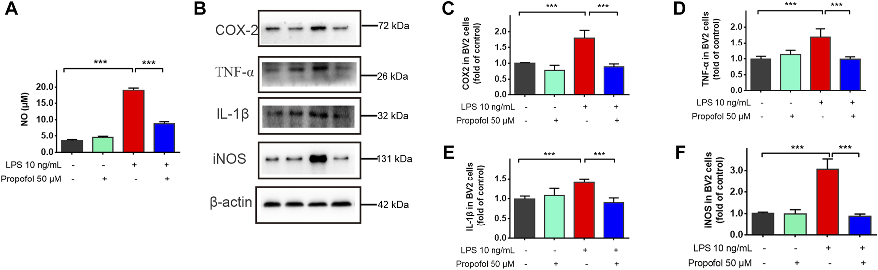 Propofol downregulates lipopolysaccharide-stimulated production of proinflammatory mediators in microglial cells. BV2 microglial cells were treated with lipopolysaccharide (10 ng/mL) and propofol (50 μM). (A) At 24 h of treatment, the production of a nitric oxide was measured by Griess assay. (B–F) At 9 h of treatment, the expression of COX-2, TNF-α, IL-1β and iNOS was measured by Western blot. Data are means ± SD (n = 6 independent measurements); ***p < 0.001 for comparisons shown.