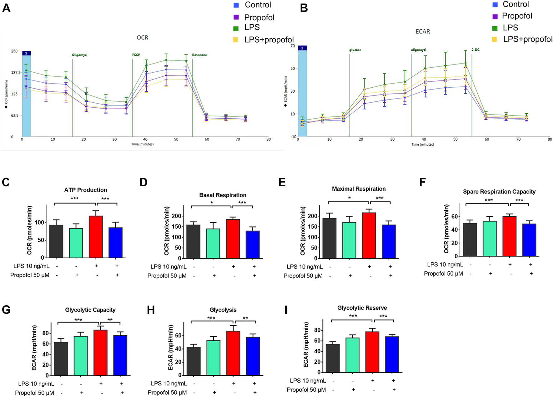 Propofol regulates mitochondrial and glycolytic function in microglia. BV2 microglial cells were treated with lipopolysaccharide (10 ng/mL) and propofol (50 μM) for 9 h (A–I) The dynamic changes of glycolysis and TCA cycle were measured by ECAR and OCR, respectively, using a Seahorse extracellular flux analyzer. Data are means ± SD (n = 12 independent measurements); *p < 0.05, **p < 0.01, ***p < 0.001 for comparisons shown.
