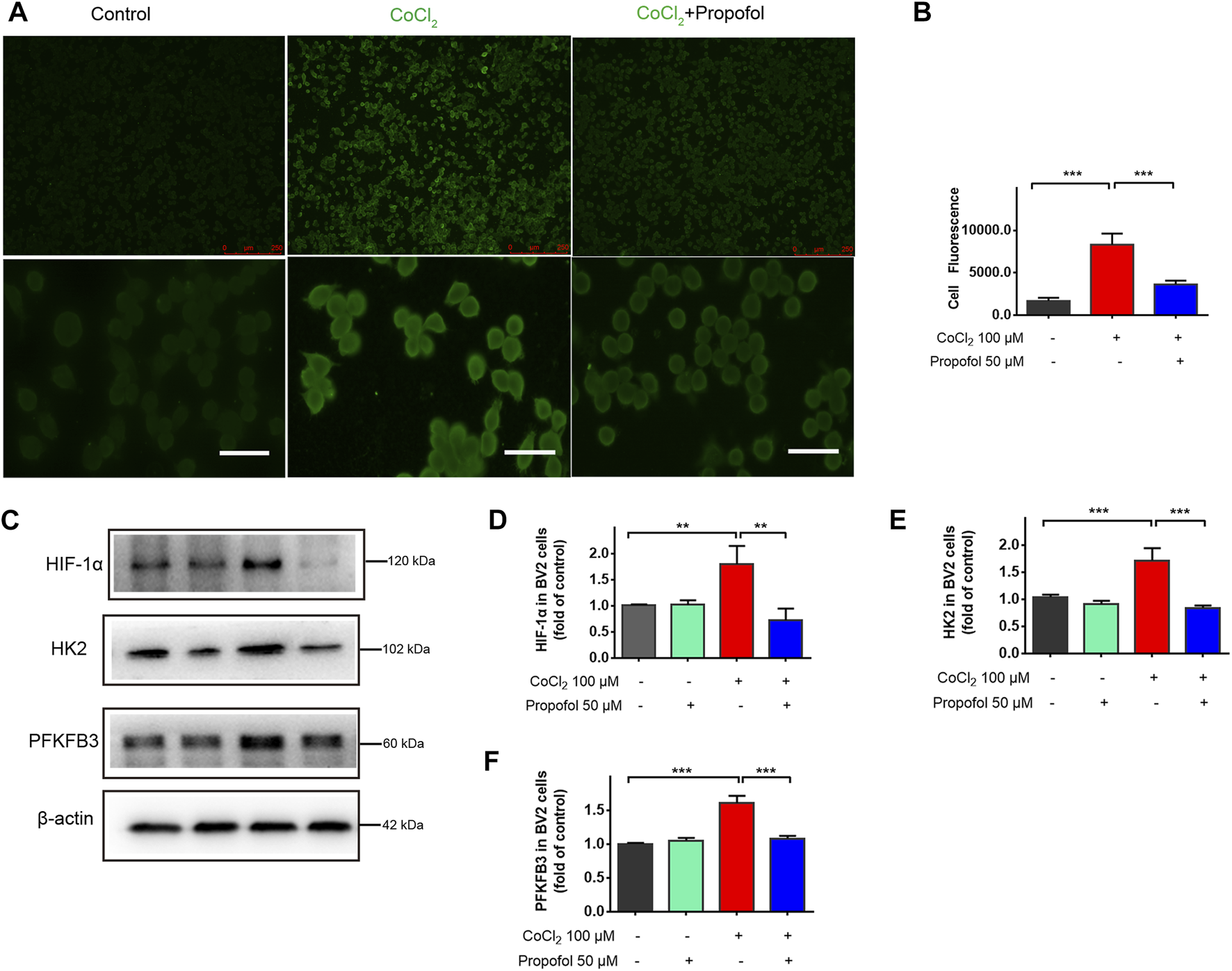 Propofol inhibits HIF-1α and glycolytic enzymes expression in CoCl2-treated microglia. BV2 cells were pretreated with 100 μM CoCl2 for 24 h and then treated with 50 μM propofol for 9 h. (A) The fluorescent micrographs of HIF-1α expression (scale bar below: 25 μm). (B) The fluorescence intensity of HIF-1 α staining qualified with ImageJ. (C–F) The expression of HIF-1α, HK2 and PFKFB3 by Western blot. Data are expressed as means ± SD (n = 3 independent measurements); **p < 0.01; ***p < 0.001 for comparisons as shown.