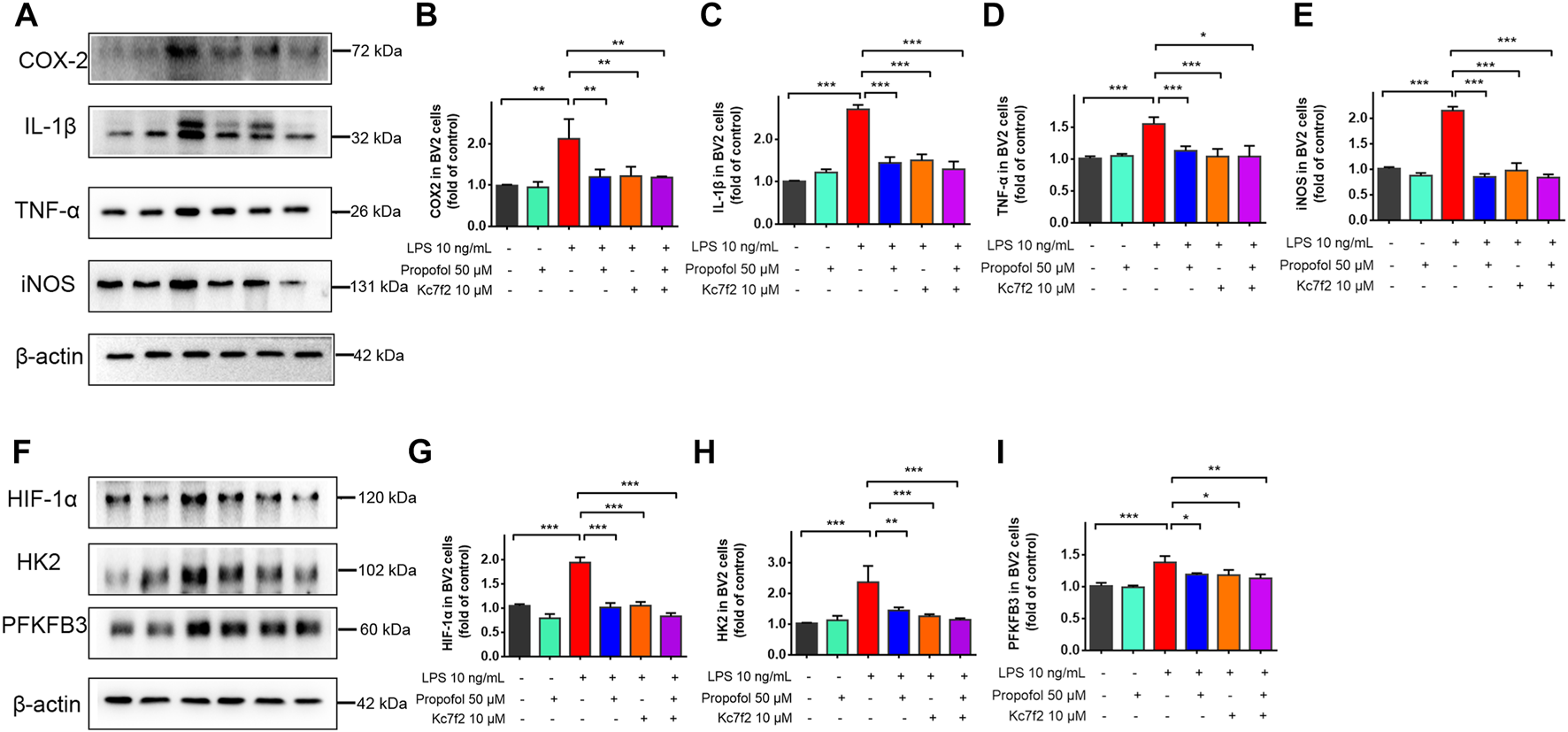 The inhibitory effect of propofol on microglial activation via HIF-1α-glycolysis. Six groups of randomly assigned cells were treated with medium vehicle (control), propofol, lipopolysaccharide (LPS), LPS + propofol, LPS + Kc7f2, Kc7f2. (A–I) The expression of COX-2, TNF-α, IL-1β, iNOS, HIF-1α, HK2 and PFKFB3 by Western blot. Data are expressed as means ± SD (n = 3 independent measurements); *p < 0.05; **p < 0.01; ***p < 0.001 for comparisons shown.