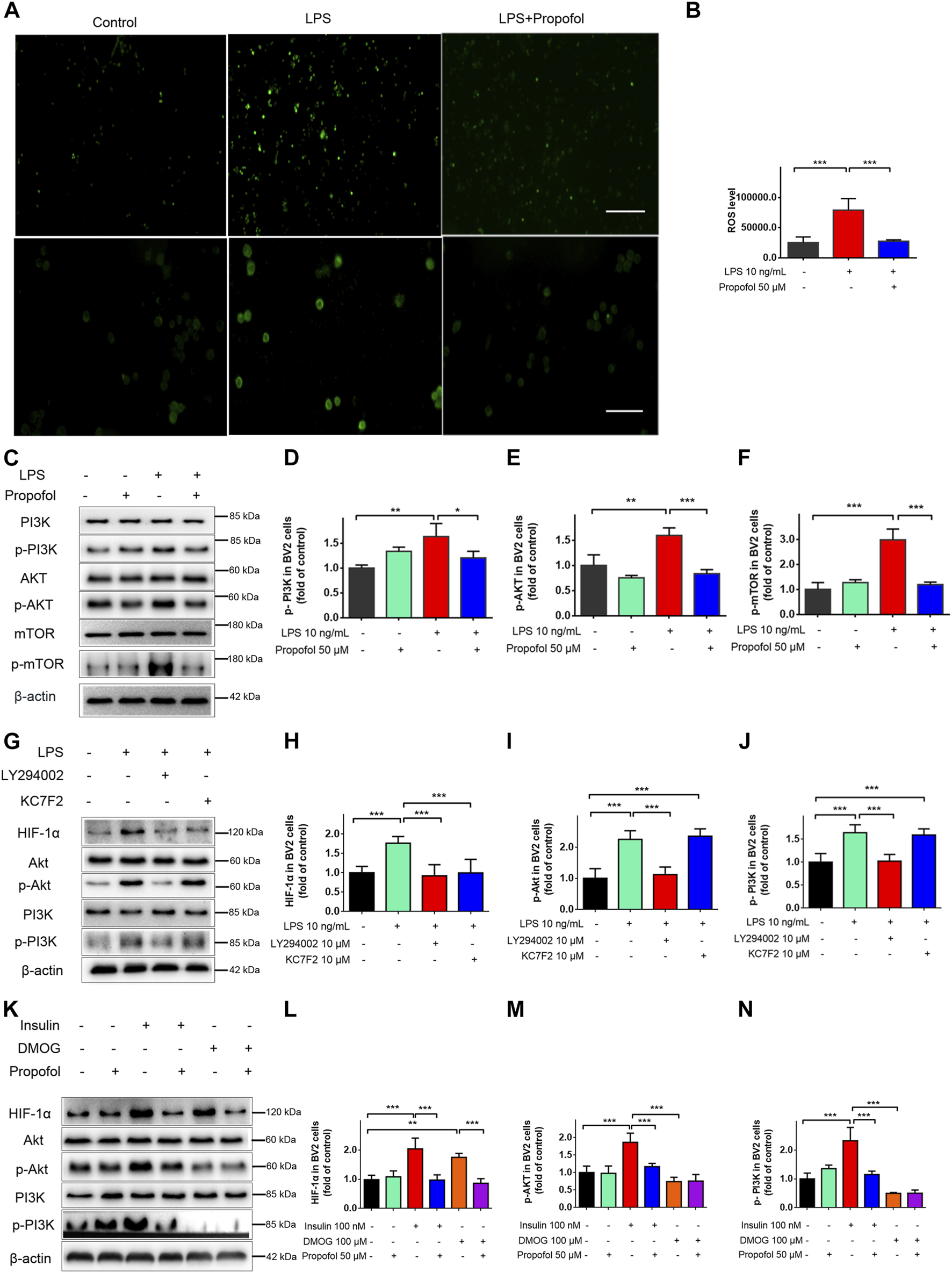 Propofol regulates HIF-1α-mediated metabolic reprogramming through inhibiting ROS/PI3K/Akt/mTOR signaling pathway in microglia. (A, B) The ROS fluorescence (scale bar below: 50 μm). (C–F) The expression of PI3K, Akt and mTOR after 9 h of treatment with lipopolysaccharide (LPS) (10 ng/mL) and/or propofol (50 μM) (n = 3 independent measurements). And then BV-2 cells were pretreated with LY294002, Kc2f7, DMOG, or Insulin, followed by treatment with lipopolysaccharide or propofol for 9 h (G–N) The expression of PI3K, p-PI3K, Akt, p-Akt and HIF-1α. Data are expressed as means ± SD (n = 4 independent measurements); *p < 0.05, **p < 0.01, ***p < 0.001 for comparisons shown.