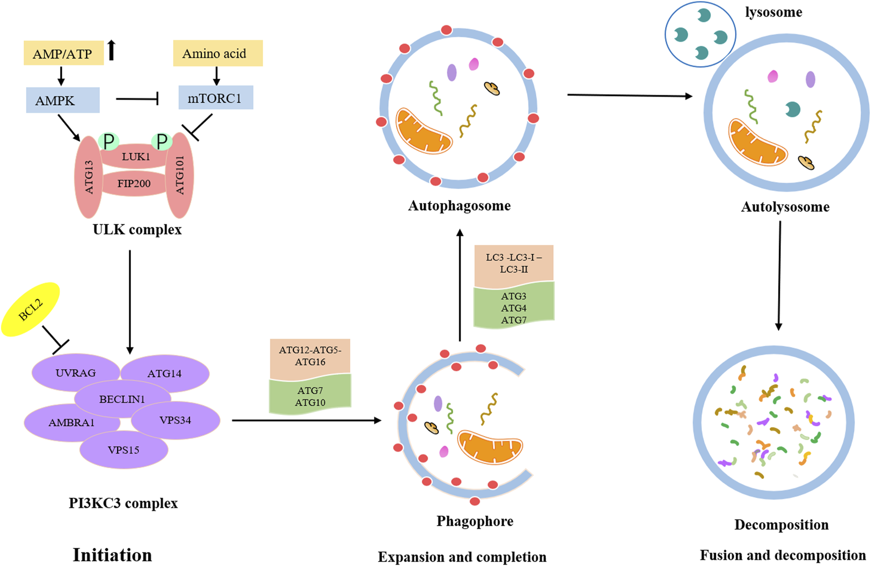 The detailed process of autophagy is shown in Figure 1. Autophagy is initially triggered by various stress conditions, including hypoxia, oxidative stress, infection, nutritional deficiencies, and growth factor reduction. These autophagy-trigger signals cause the activation of MAPK and mTOR pathways, promoting or inhibiting the progression of autophagy. The process of autophagy can be divided into the following three main phases: (Norquist et al., 2016) Initiation phase, wherein the pre-initiation complex, unc-51-like kinase (ULK), composed of ULK1, ATG13, ATG101, and FIP200 is activated, which leads to the phosphorylation of the class III PI3K (PI3KC3) complex, consisting of BECN-1, UVRAG, AMBRA1, VPS15, and VPS34 (Russell et al., 2013). This complex recruits ATG9-containing vesicles to trigger phagophore nucleation. Meanwhile, the activated PI3KC3 complex can be inhibited by BCL2; (Kuchenbaecker et al., 2017) Expansion and completion phase, wherein the most critical step is to recognize cargo and lengthen phagophore, which is conducive to forming the autophagosome. At this stage, there are two vital ubiquitin–like conjugation pathways (Klionsky and Schulman, 2014). The first one involves the combination of ATG12 and ATG5 to form ATG5-ATG12 conjugate and interacts with ATG16L1, leading to the formation of the ATG12-ATG5-ATG16L1 complex. This ubiquitin–like conjugation pathway requires the participation of ATG7 and ATG10. The second stage consists of the cleavage of LC3 into LC3-Ⅰ with the help of ATG4, and then LC3-Ⅰ is converted into LC3-II with the catalysis of ATG7 and ATG3. Consequently, LC3-II is coupled with phosphatidylethanolamine to promote the expansion of the phagophore and the formation of autophagosomes; (La Vecchia, 2017) Fusion and decomposition phase, in which autophagosomes further fuse with lysosomes to form autolysosomes, where activated lysosomal hydrolase decomposes the substrate. Eventually, the degraded substrate is transferred to the cytoplasm for cell recycling.