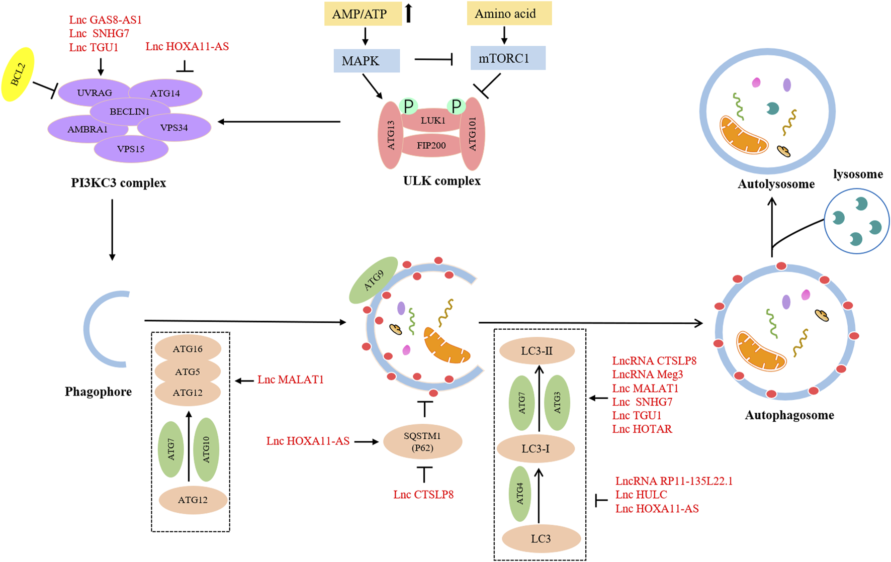 The lncRNAs are aberrantly expressed in many cancers and closely related to onset, development, metastasis, and drug resistance in many cancers via the regulation of autophagy (Chen et al., 2017; Xin et al., 2018; Wang et al., 2019). With advances in research, some scholars have deepened their understanding of lncRNAs in the modulation of autophagy (Table 2; Figure 3).