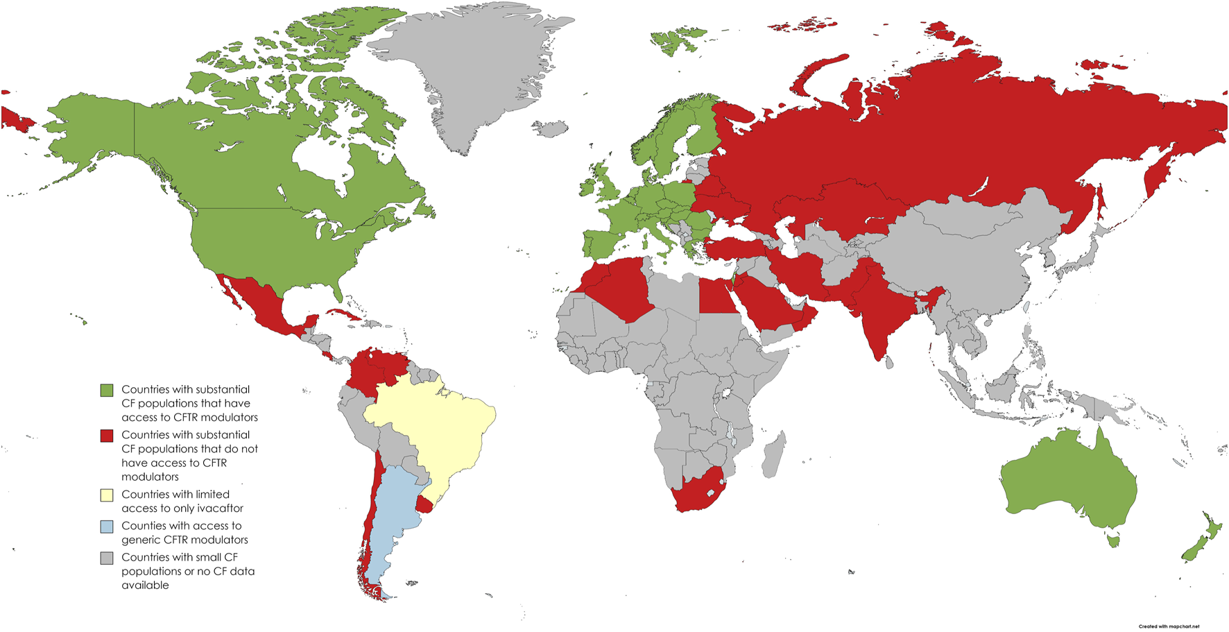 World map distribution of countries with access to CFTR modulator drugs or negotiated agreements in place (adapted from Guo et al. (2022a) and personal communications with “Vertex Save Us” campaign).