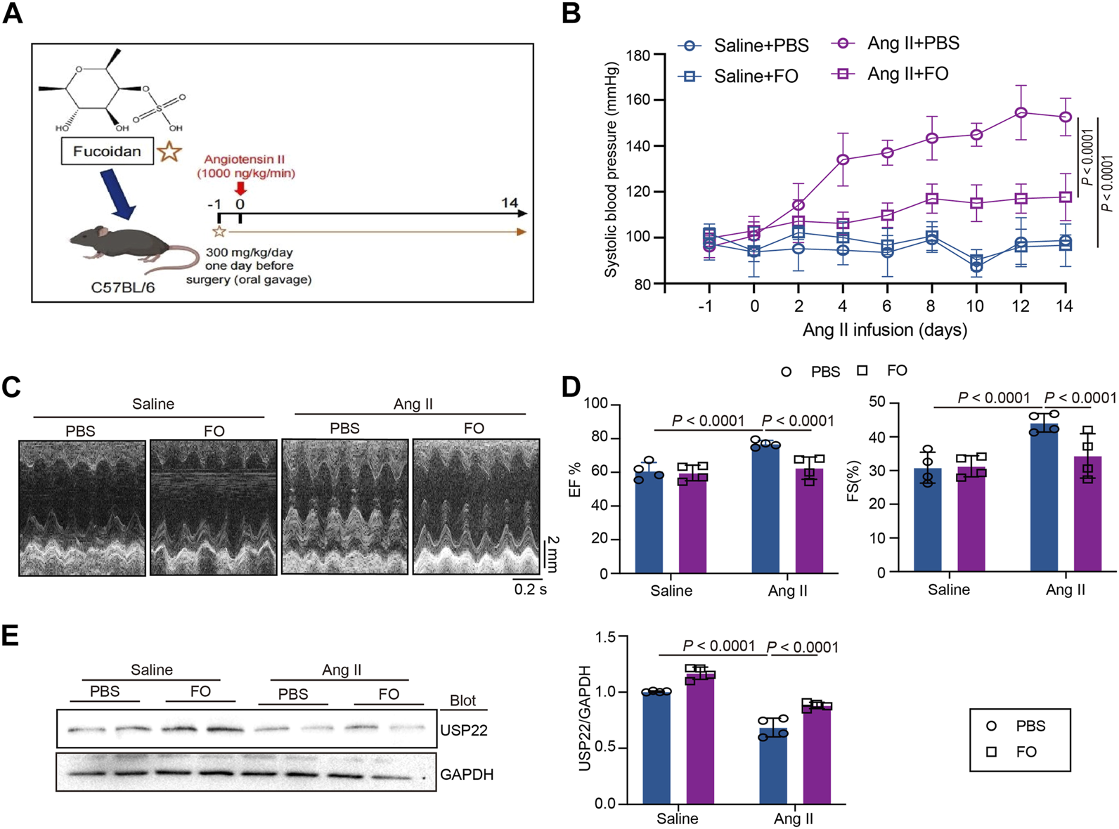 Results: Our data showed that USP22 expression was lowered in Ang II-infused animals and cells, which could promote cardiac dysfunction and remodeling. However, treatment with FO significantly upregulated the expression of USP22 and reduced the incidence of cardiac hypertrophy, fibrosis, inflammation, and oxidative responses. Additionally, FO treatment lowered p53 expression and apoptosis while increasing Sirt 1 and Bcl-2 expression.