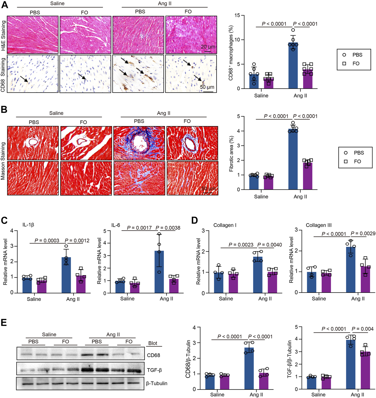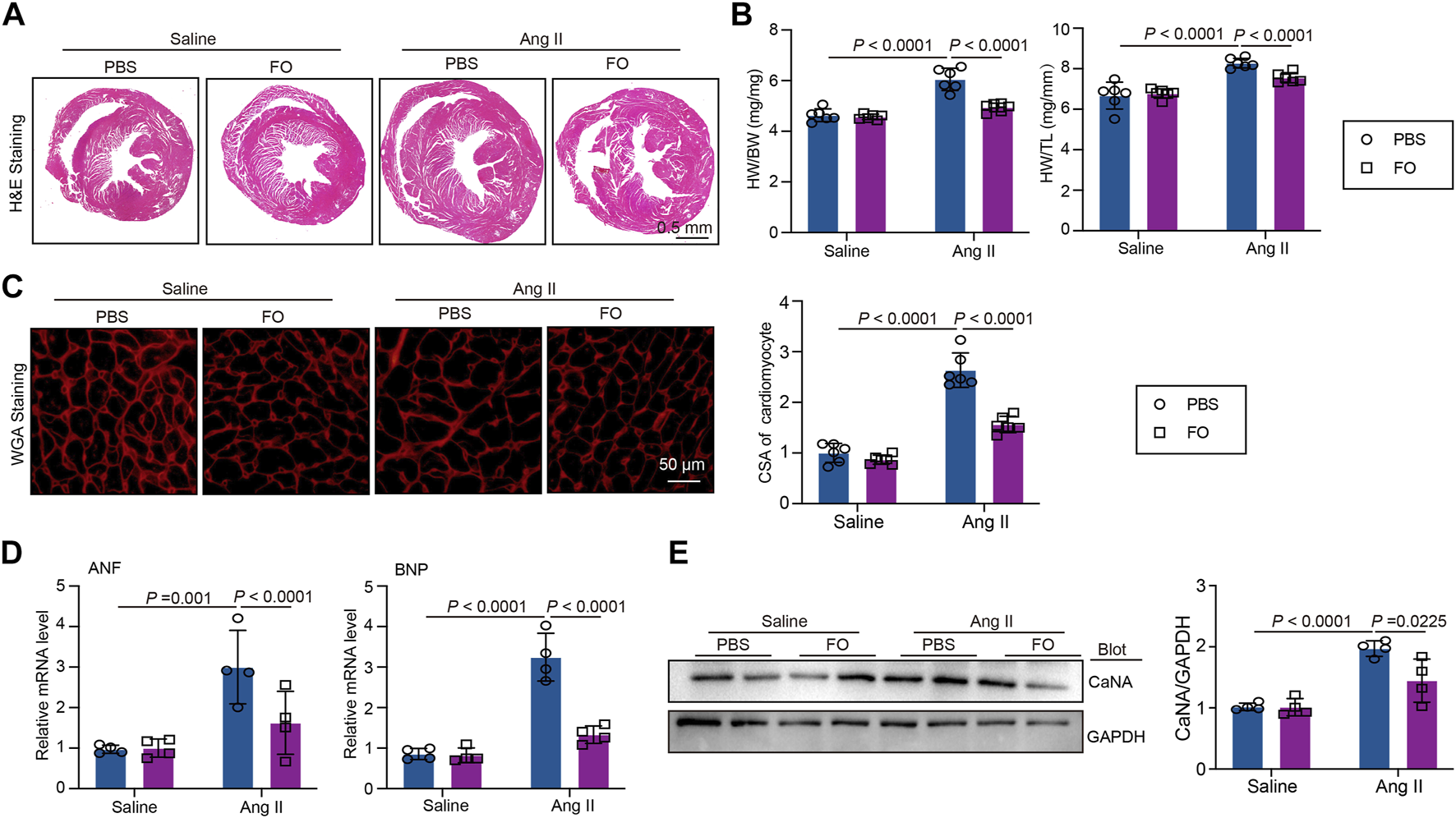 Four groups of forty wild-type (WT) C57BL/6 male mice (8 weeks old) were used. Using osmotic mini-pumps (Alzet Model 1007D or 1002, DURECT), the mice were infused for 7 or 14 days with normal saline or Ang II (1,000 ng/kg/min, Aladdin) (Bai et al., 2022). The mice were given an oral gavage of FO (300 mg/kg/day) or PBS (internal control) the day before surgery, followed by a 14-day infusion of Ang II or saline (Yu et al., 2020). All mice received an intraperitoneal injection of 2.5% tribromoethanol (0.02 mL/g, Sigma‒Aldrich) to induce anesthesia after receiving therapy for 14 days. The hearts were removed and used for future research.