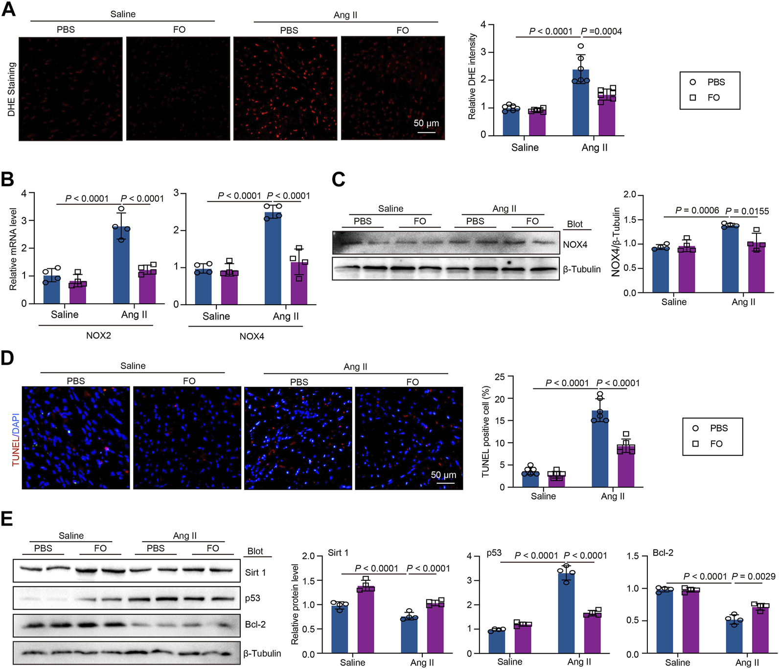 DHE staining demonstrated that FO therapy could reduce the oxidative response in animals that had received Ang II (Figure 5A). In Ang II-infused animals, the expression of oxidative marker NOX2 and NOX4 (Figure 5B). Similarly, in Ang II-infused mice, FO reduced the production of NOX4 protein which are involved in oxidative signaling cascade (Figure 5C). The TUNEL assay results demonstrated that Ang II infusion increased the incidence of apoptosis compared to that in animals that received saline infusions, and the effect was alleviated by FO (Figure 5D). The expression of Sirt 1, p53, and Bcl-2 was then measured. In contrast to saline-infused mice, Ang II-infused mice exhibited increased expression of p53 and decreased expression of Sirt 1 and Bcl-2, but FO therapy attenuated these responses (Figure 5E). These findings indicated that Sirt1 deubiquitination by USP22 overexpression could prevent p53 transcriptional activation, although this work had significant limitations. Future research will need to confirm the link between USP22 and Sirt 1 and their impact on p53 in basic myocardial cells.