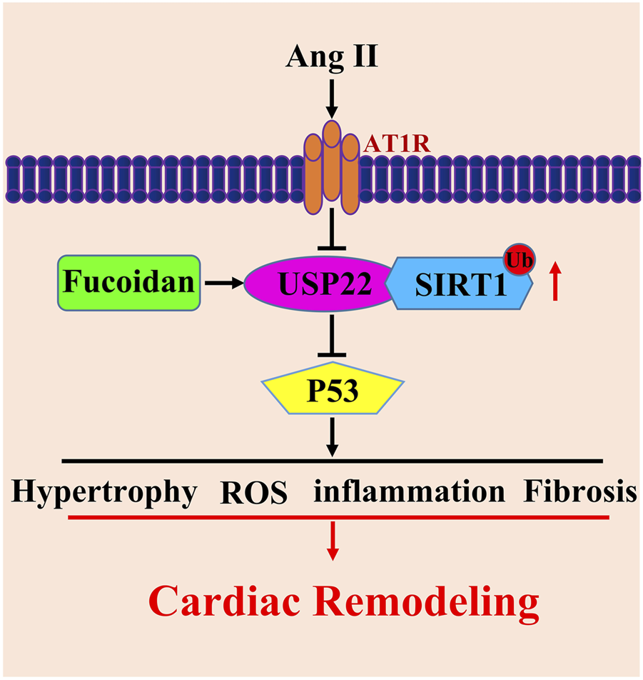 Fucoidan (FO) is a fucose-enriched sulfated polysaccharide that is mostly produced by brown algae and has been extensively used as a dietary supplement and health food because of its many positive effects, including anti-inflammatory, anticancer, and antidiabetic effects (Li and Ye, 2008; Zhang SM et al., 2015; Fitton HJ et al., 2019). An FO preparation called ‘Haikun Shenxi capsules’ was approved in China in 2003, and its clinical use as a treatment for chronic renal failure has been described (Fitton HJ et al., 2019). This preparation has been shown to alleviate diabetes-induced kidney fibrosis by increasing the levels of USP22 and inducing deubiquitination of the Sirt1 protein through overexpression (Yu et al., 2020). However, the molecular processes underlying the functions of USP22 and Sirt1 in Ang II-induced ventricular hypertrophy are unknown.