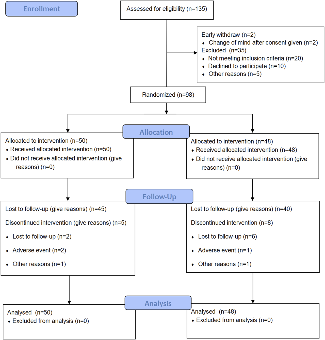 Participants were free to withdraw at any time during the trial. Participants who wish to withdraw were offered the option to cease trial medication but continued to attend scheduled visits for outcome measurements. Participants who withdraw were traced to investigate the reason for withdrawal. Participants were advised to discontinue the treatment if there was a product-related serious adverse event or if the participant was not compliant with the study requirements. Intention-to-treat analysis were performed on missing data from discontinuers with the last observation carried forward method.