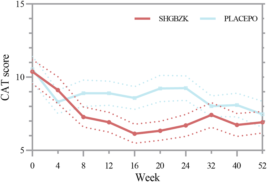 FIGURE 2. Measures of CAT score CAT score in the SHGBZK group and place at week 0, 4, 12, 32, and 52.