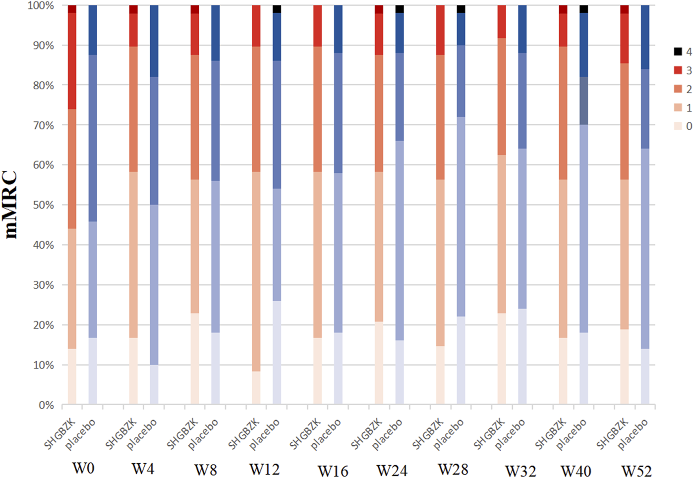 FIGURE 3. Measures of mMRC scale mMRC in SHGBZK group and placebo at week 0, 4, 8, 16, 24, 28, 32, 40, and 52.