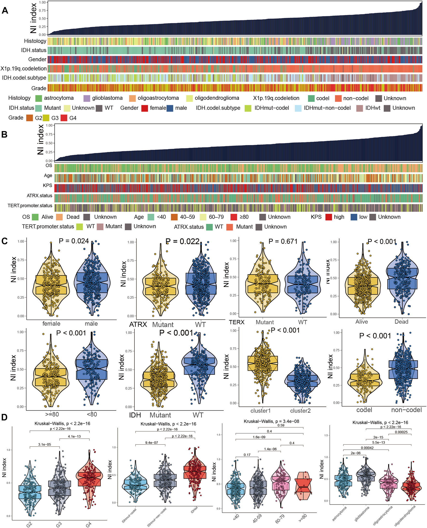 Clinical and molecular characteristics of glioma associated with NI. (A,B) A comprehensive analysis of the relationship between NI and clinicopathological characteristics of patients. (C) Violin plots of NI in glioma patients, stratified by gender, age, ATRX mutation, IDH mutation, TERX mutation, OS status, and 1p19q codel. (D) Violin plots of NI in glioma patients, stratified by grades, IDH mutation, ages, and histological classification.