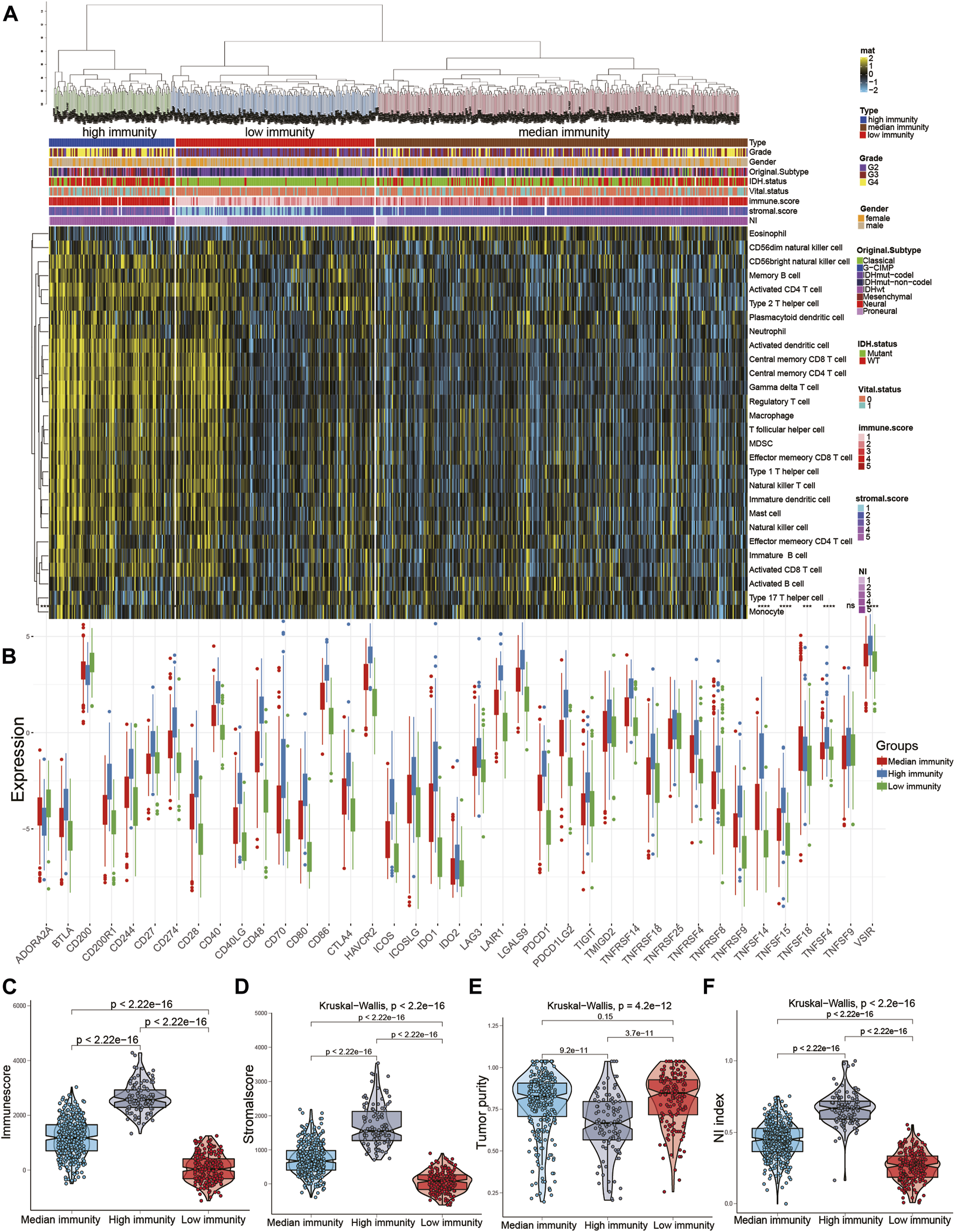 Relationship between NI and immune subgroups of gliomas. (A) The immune subgroups of glioma were classified based on the overall immune activity of glioma. (B) Quantitative analysis of the proportion of immune checkpoint in three immune subtypes. (C–F) Quantitative analysis of NI and ESTIMATE score in three immune subtypes.