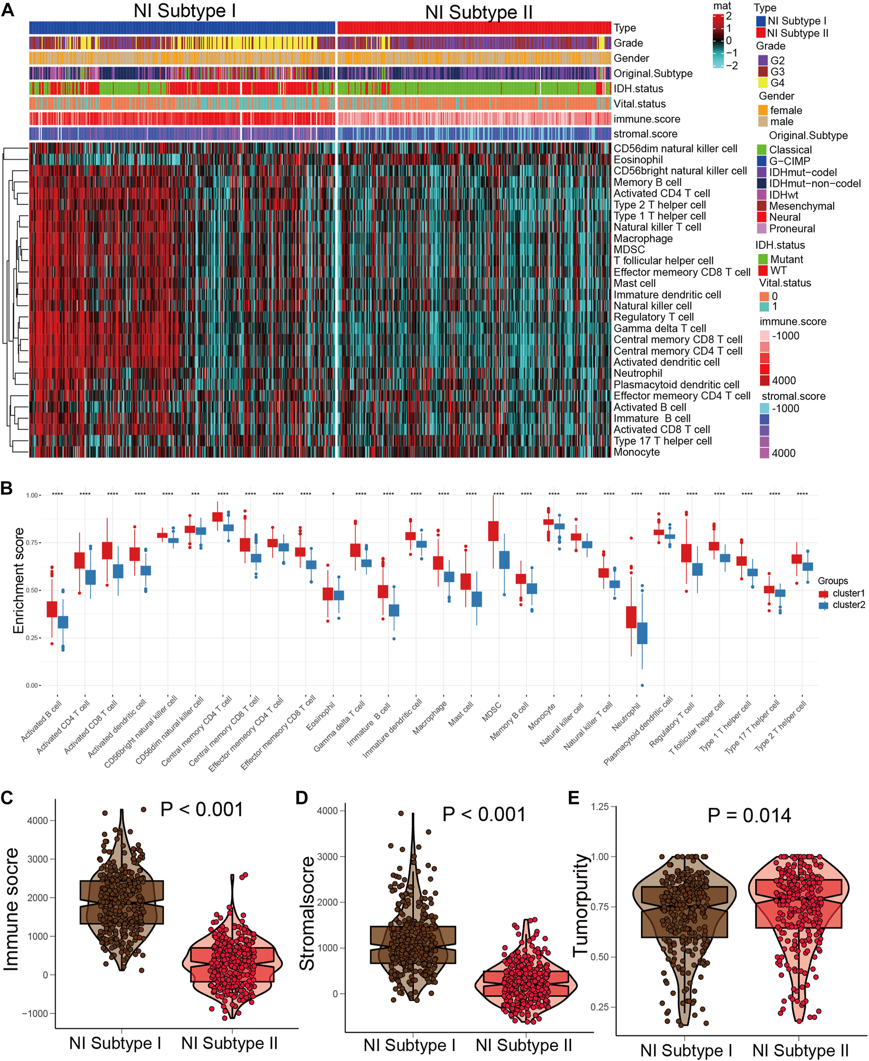 Distinct immune patterns of two NI subgroups. (A) Quantitative analysis of ESTIMATE score between two NI subgroups. (B) Quantitative analysis of the proportion of immune cells in two subgroups. (C–E) The expression levels of ESTIMATE score in NI subgroup I and II.