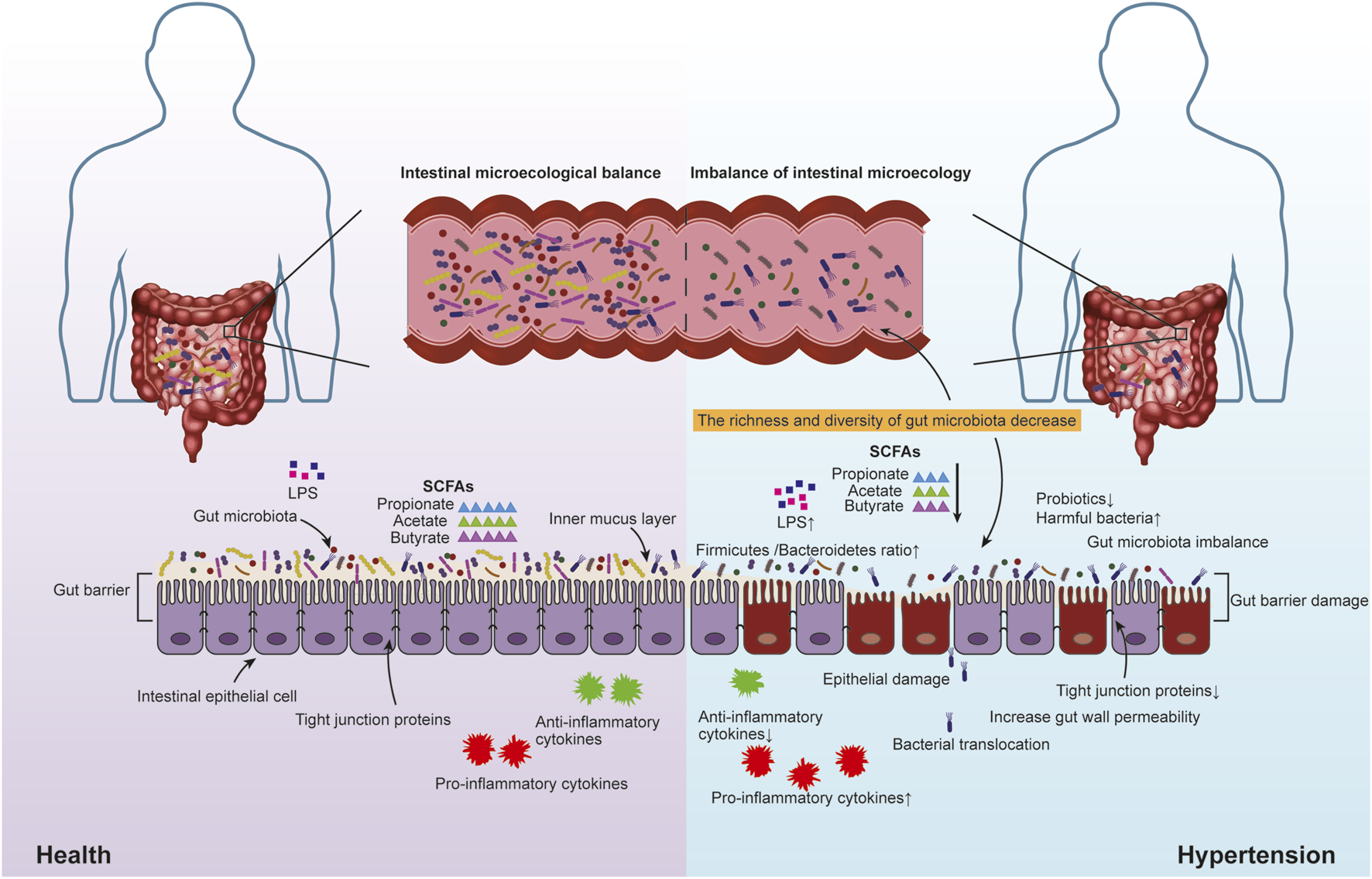 In a healthy state, the intestinal microecology of the human body is in dynamic balance. Intestinal microecology disorders in hypertensive patients include decreased abundance and diversity of gut microbiota, increased harmful bacteria, decreased beneficial bacteria, abnormal metabolites of gut microbiota, decreased tight junction protein, intestinal barrier dysfunction, increased intestinal permeability and so on.