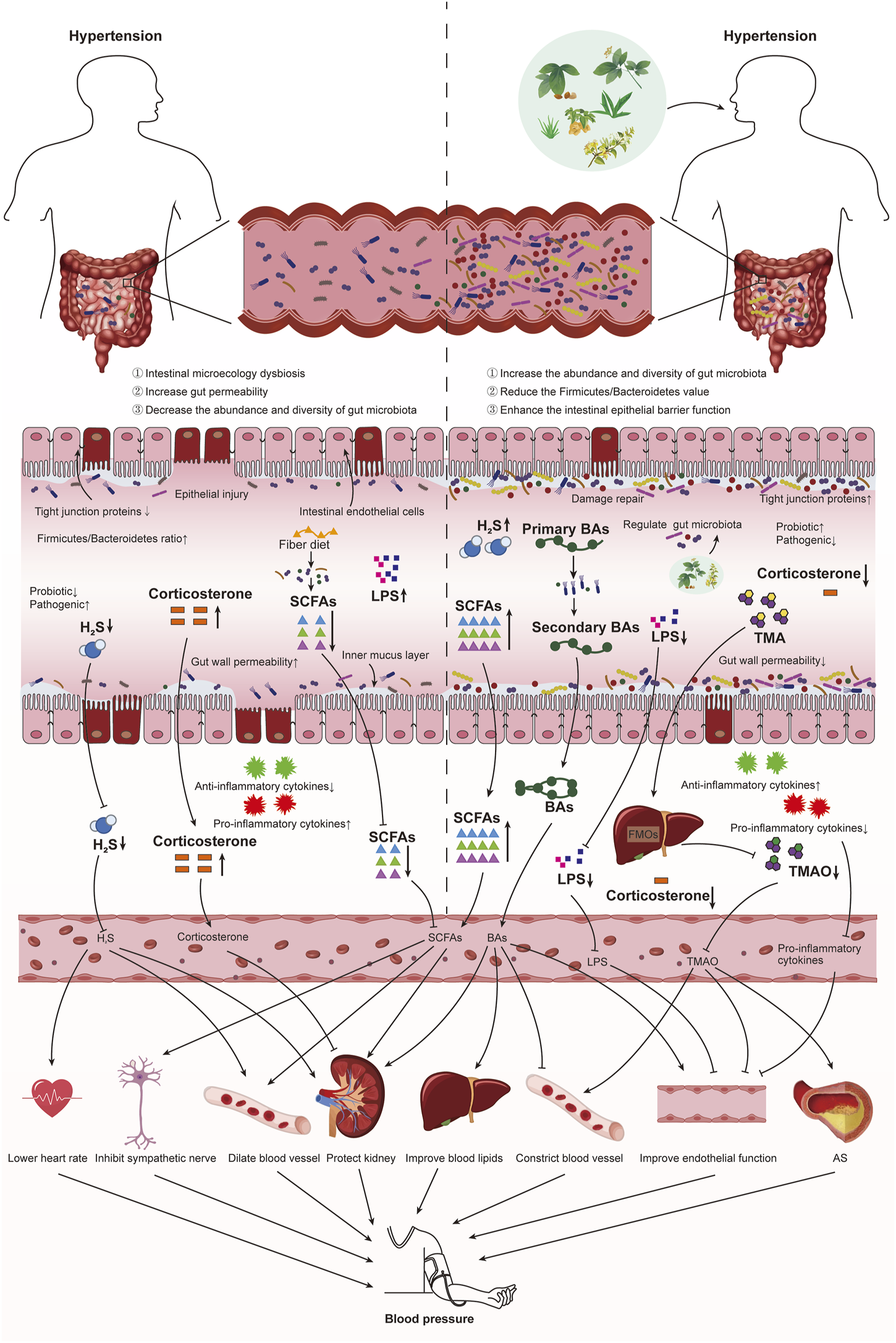 Ways of TCM to treat hypertension by regulating intestinal microecology. Hypertension patients with intestinal microecology disorder, intestinal barrier dysfunction, increased intestinal permeability, and gut microbiota imbalance, resulting in abnormal production of gut microbiota metabolites (SCFAs, TMAO, BAs, H2S, and LPS). Metabolites produced by the gut microbiota cross the intestinal barrier into the blood vessels, and they reach the whole body through blood circulation to affect organ function and then affect BP. On the one hand, TCM improves BP by improving intestinal barrier function, increasing intestinal tight junction protein and reducing intestinal permeability. On the other hand, it regulates BP by improving gut microbiota disorders and regulating gut microbiota metabolites (SCFAs, TMAO, BAs, H2S, and LPS).
