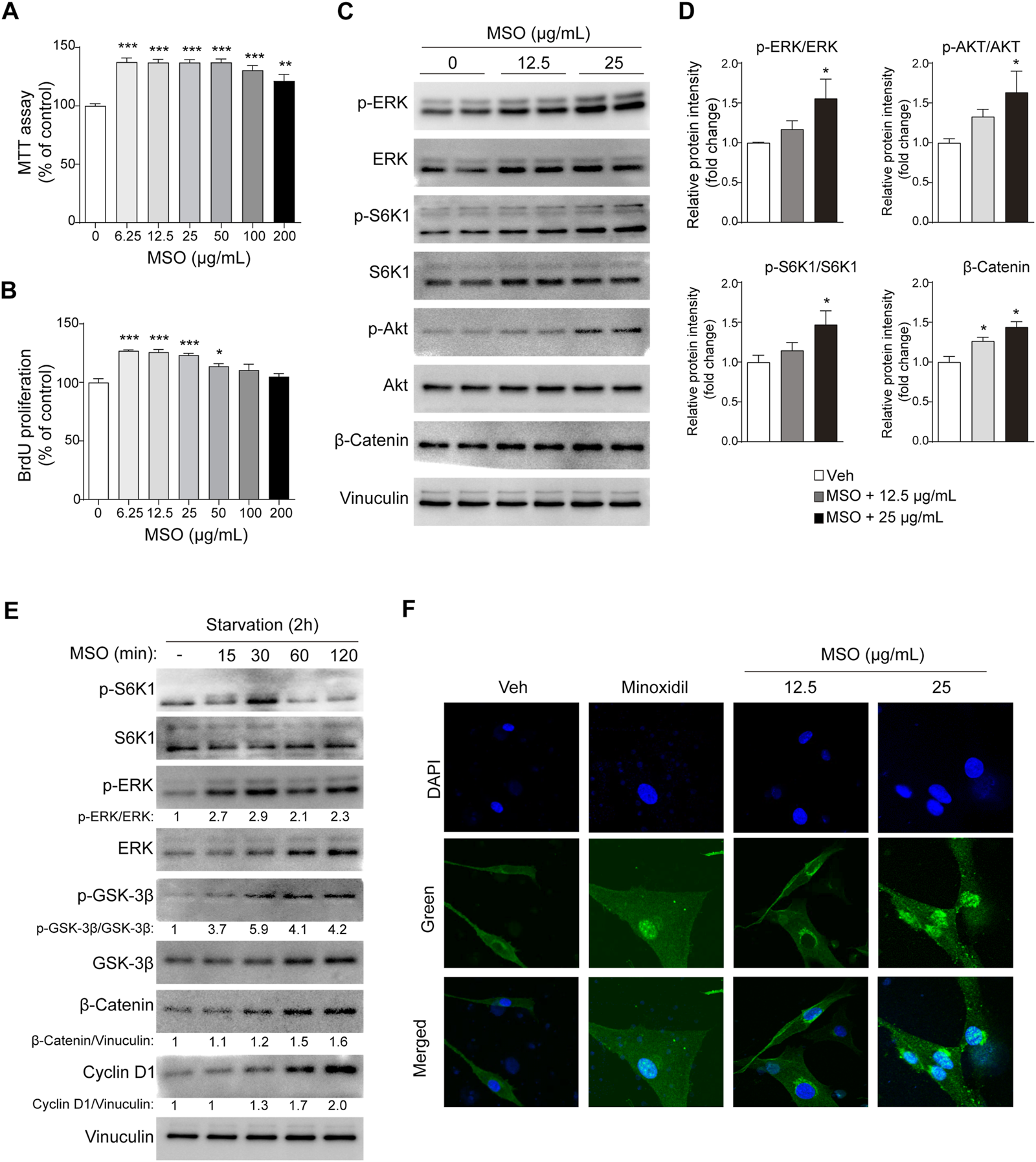 Effect of MSO on the proliferation of HFDPCs. HFDPCs were treated with MSO for 24 h. (A) Cell proliferation was measured using the MTT assay (B) BrdU cell proliferation assay evaluated cell populations that synthesize DNA. (C) HFDPCs were treated with MSO at concentrations of 0, 12.5, and 25 μg/mL for 24 h. Cell proliferation-related markers were analyzed by using Western blotting. (D) Relative protein levels of proliferation-related biomarkers were quantified using ImageJ. Values are expressed as the ratio of phospho-form protein to total-form protein and represented as mean ± SEM. (E) After seeding the cells and incubating for 24 h, the medium was changed to FBS-free medium. MSO was treated at a concentration of 25 μg/mL at time intervals to observe changes in markers in a state in which nutrients were depleted. The Wnt/β-catenin pathway of HFDPCs in starvation conditions was analyzed by using Western blotting. (F) Immunostaining was performed to evaluate the translocation of β-catenin to the nucleus in HFDPCs. *, p < 0.05; **, p < 0.01; ***, p < 0.001 compared to the negative control group. Abbreviations: HFDPCs, human hair follicle dermal papilla cells; CDK2, cyclin-dependent kinase 2; Cdc2, cell division cycle protein 2; ERK, extracellular signal-regulated kinase; MSO, millet seed oil; S6K1, ribosomal protein S6 kinase beta-1.