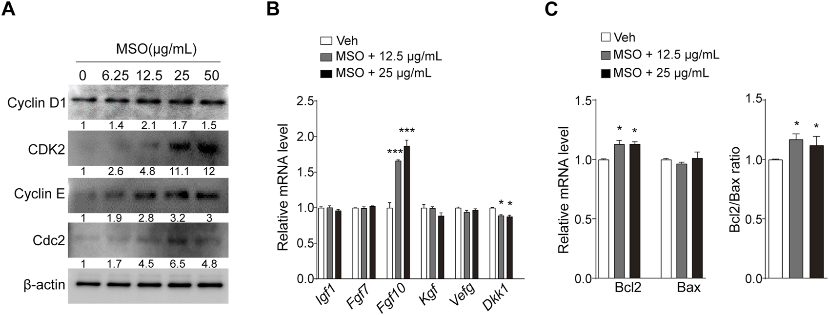 To investigate the mechanism by which MSO regulates cell growth, the expression of cell cycle-related proteins was measured. Cell-cycle progression is known to be mediated by CDKs and their regulatory cyclin subunits (Malumbres, 2014), and we found that the expression levels of CDK2, cyclin D1, cyclin E, and CDC2 increased in an MSO-concentration-dependent manner (Figure 2A). Next, we investigated whether MSO regulates growth factor genes in HFDPCs. Growth factors mediate the hair-growth cycle and hair morphogenesis (Lin et al., 2015). MSO treatment significantly increased Fgf10 gene expression at a concentration of 25 μg/mL (Figure 2B). In contrast, the expression of DKK-1 was significantly decreased following MSO treatment. In addition, MSO significantly increased the expression of the anti-apoptotic marker BCL-2 and the BCL-2/BAX ratio (Figure 2C).