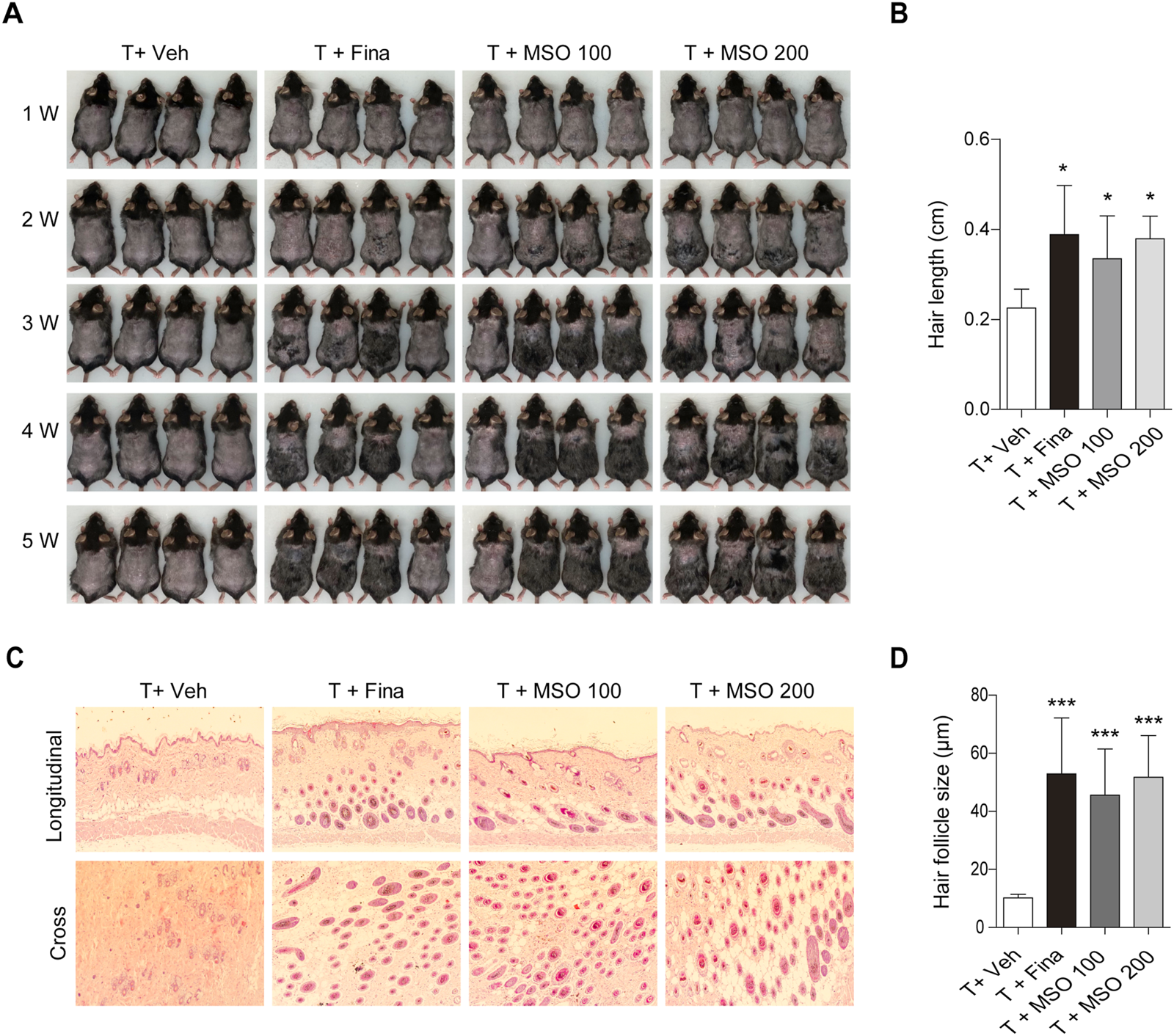 Effect of MSO on hair growth of C57BL/6 mice. (A) Hair phenotype after testosterone injection. Photographs were obtained once a week. (B) Mouse hair length was measured at 5 weeks. (C) The effect of MSO on the hair follicles was analyzed using hematoxylin and eosin (H&E) staining of mouse skin. (D) Hair follicle size was measured using CaseViewer software. Values represent mean ± SEM. *, p < 0.05; **, p < 0.01; ***, p < 0.001 compared to the vehicle (T + Veh) group. Abbreviations: MSO, millet seed oil.