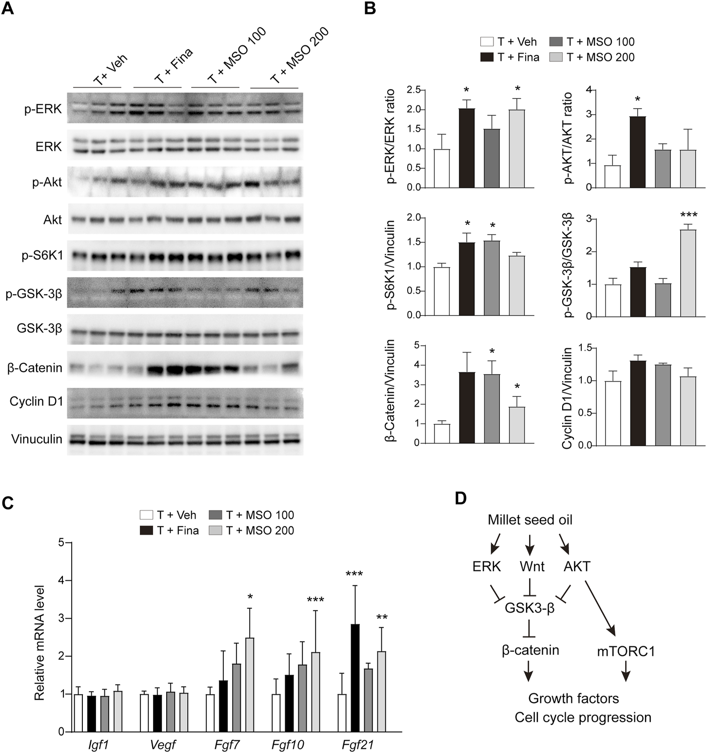 Effect of MSO on hair growth of C57BL/6 mice. (A) The Wnt/β-catenin pathway of skin was analyzed using Western blotting. (B) Relative protein levels of proliferation-related biomarkers in skin were observed using ImageJ software. Values represent mean ± SEM. *, p < 0.05; **, p < 0.01; ***, p < 0.001 compared to the vehicle (T + Veh) group. Abbreviations: MSO, millet seed oil. (C) mRNA levels of growth factor in skin were analyzed via RT-qPCR. (D) Schematic overview of this study. MSO activates β-catenin signaling and promotes hair growth.