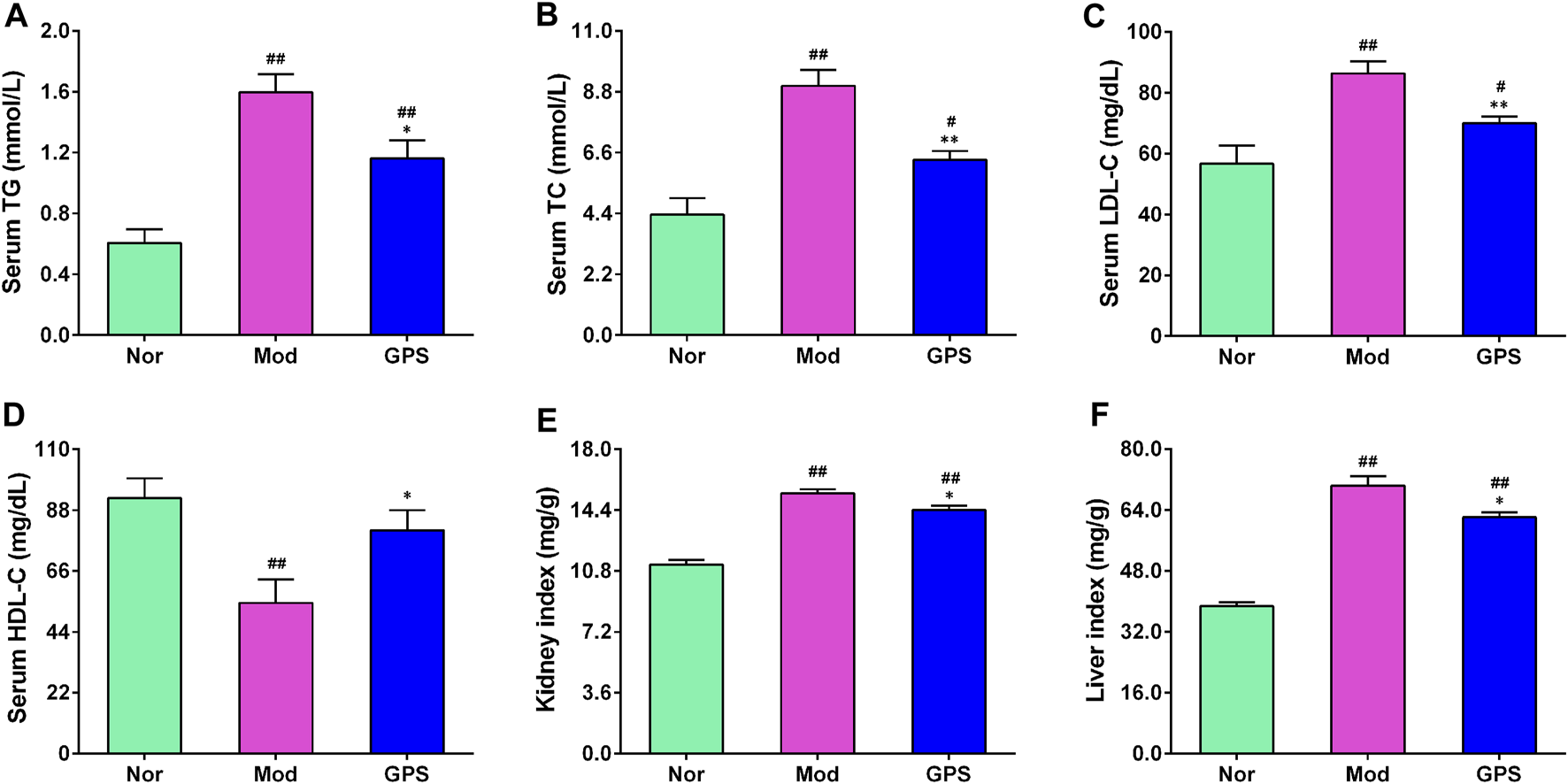 GPS ameliorated dyslipidemia in HFD and STZ-induced diabetic mice (A) Serum TG levels (B) Serum TC levels (C) Serum HDL-C levels (D) Serum LDL-C levels (E) Kidney index (F) Liver index. Data are presented as mean ± SEM, n = 10. #p < 0.05; ##p < 0.01 vs. Nor group; *p < 0.05; **p < 0.01 vs. Mod group.