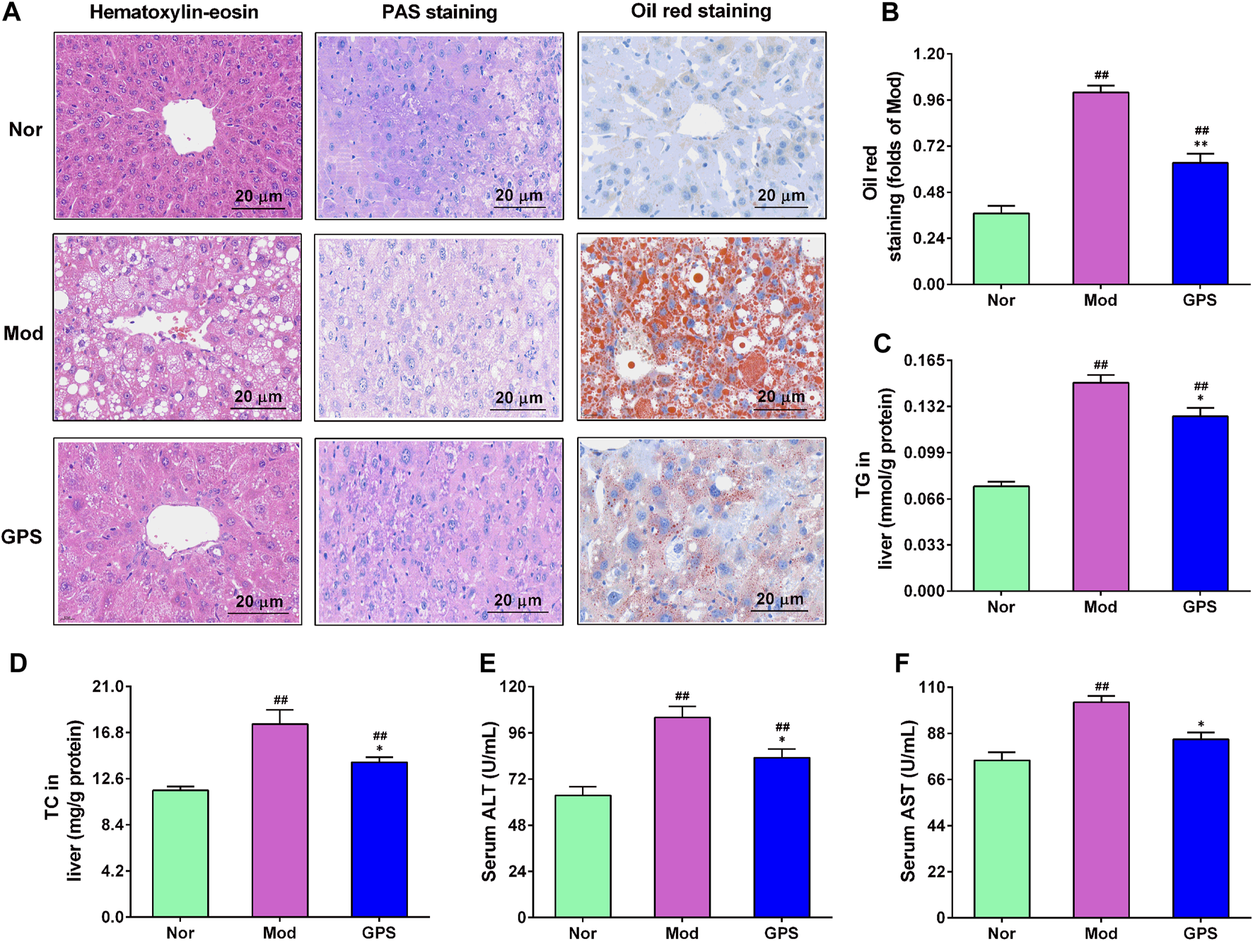 GPS mitigated hepatic steatosis in HFD and STZ-induced diabetic mice (A) Representative images of hematoxylin-eosin (HE), periodic acid-Schiff (PAS), and oil red staining of the liver of the diabetic mice, n = 4. Magnification of all images were at ×200 (B) Statistical analysis of oil red level, n = 4 (C) TG in the liver, n = 10 (D) TC in the liver, n = 10 (E) Serum ALT activities. N = 10 (F) Serum AST activities, n = 10. Data are presented as mean ± SEM. #p < 0.05; ##p < 0.01 vs. Nor group; *p < 0.05; **p < 0.01 vs. Mod group.
