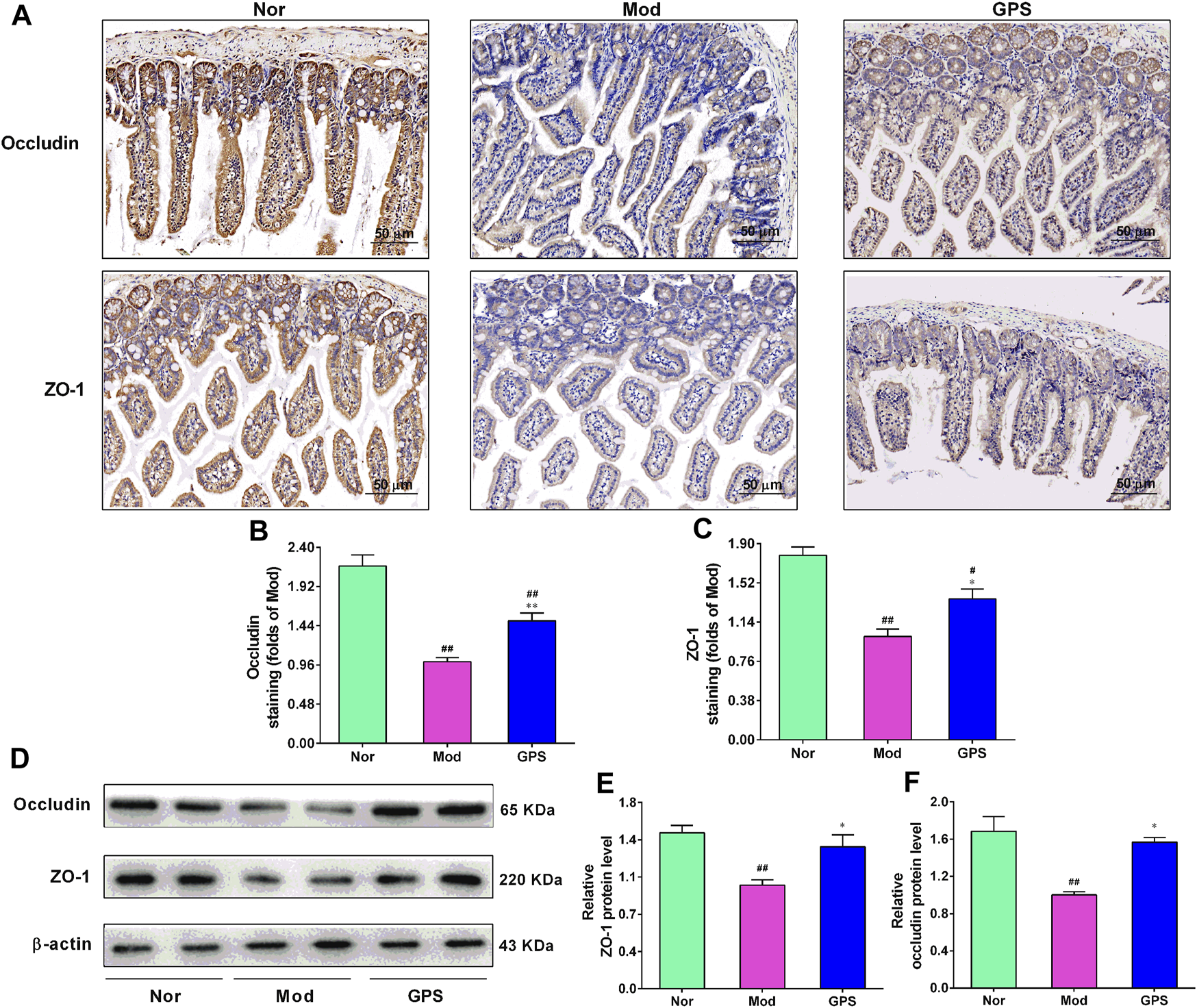 GPS enhanced intestinal integrity in HFD and STZ-induced diabetic mice (A) Representative images of immunohistochemical staining performed to determine ZO-1 and occludin expression levels in the ileum of the diabetic mice, n = 4. The magnification of all images is at × 200 (B) Statistical analysis of occluding protein expression, n = 4 (C) Statistical analysis of ZO-1 protein expression, n = 4 (D) Representative protein bands of ZO-1 and occludin, n = 6 (E) Relative optical density of ZO-1 levels, n = 6 (F) Relative optical density of occludin levels, n = 6. Data are presented as mean ± SEM. #p < 0.05; ##p < 0.01 vs. Nor group; *p < 0.05; **p < 0.01 vs. Mod group.