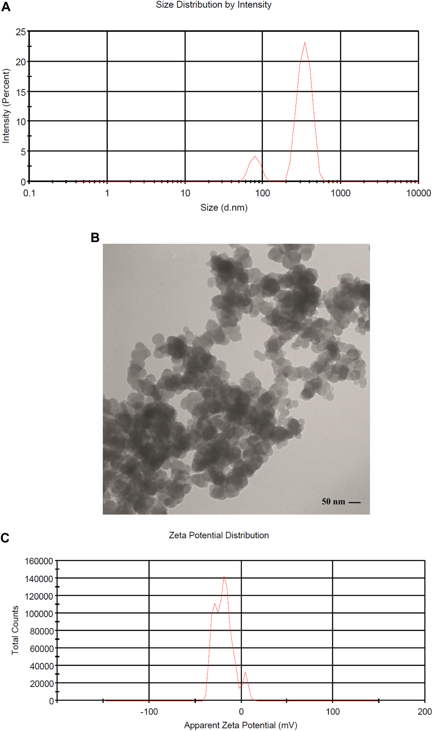 FIGURE 2. (A) DLS histogram showing the size distribution intensity of magnetic niosome NPs MNNPs, (B) Characterization of MNNPs size and morphology using Transmission Electron Microscopy (TEM), and (C) zeta potential distribution of MNNPs.