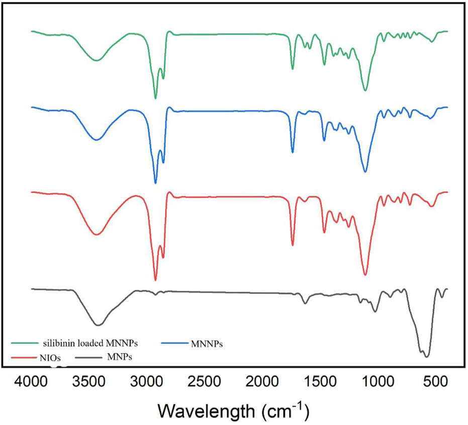 FIGURE 3. FTIR spectrum for magnetic nanoparticles (MNPs), niosomes (NIOs), magnetic niosomes nanoparticles (MNNPs), and silibinin loaded MNNPs. The results demonstrated that the silibinin was effectively encapsulated in MNNPs.