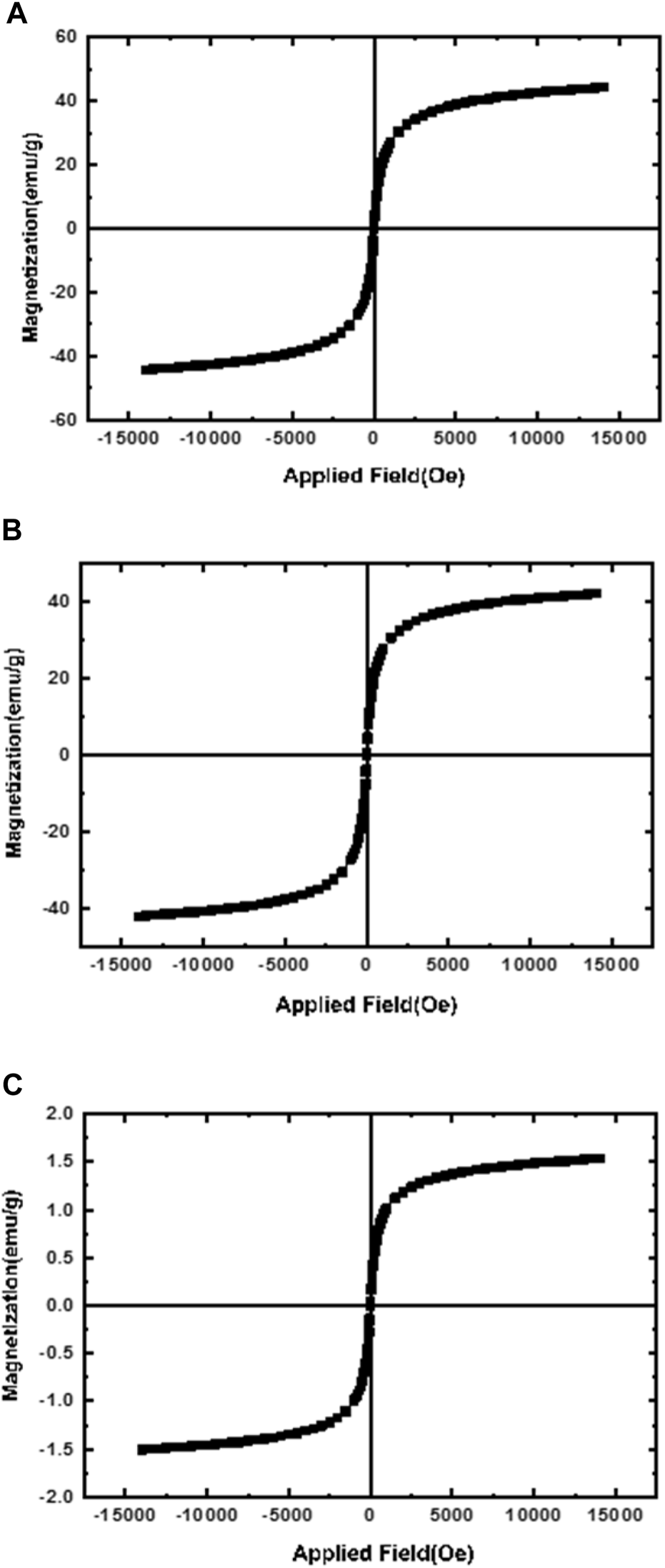 FIGURE 4. Magnetization curves of (A) magnetic nanoparticles (MNPs); (B) Starch-modified MNPs, and (C) magnetic niosomes nanoparticles (MNNPs). The results confirmed the loading of MNPs and silibinin in NIOs is done properly.