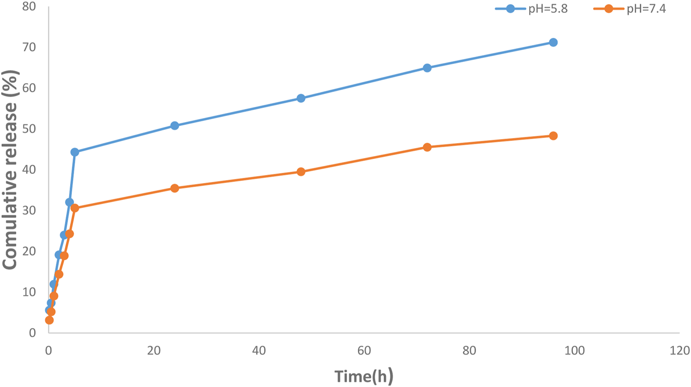 FIGURE 5. Investigation of drug release efficiency from magnetic nisome nanoparticles (MNNPs) at pH = 5.8 and 7.4 at 37°C. The pores of the dialysis membrane are large enough to allow the free movement of silibinin, but small enough to prevent the diffusion of nanoparticles. The results demonstrated a sustained release pattern from the nanoparticle with a partially burst-release at the initial stage and followed sustained during the 96 h study period. Data are presented as mean ± SD of three independent experiments.