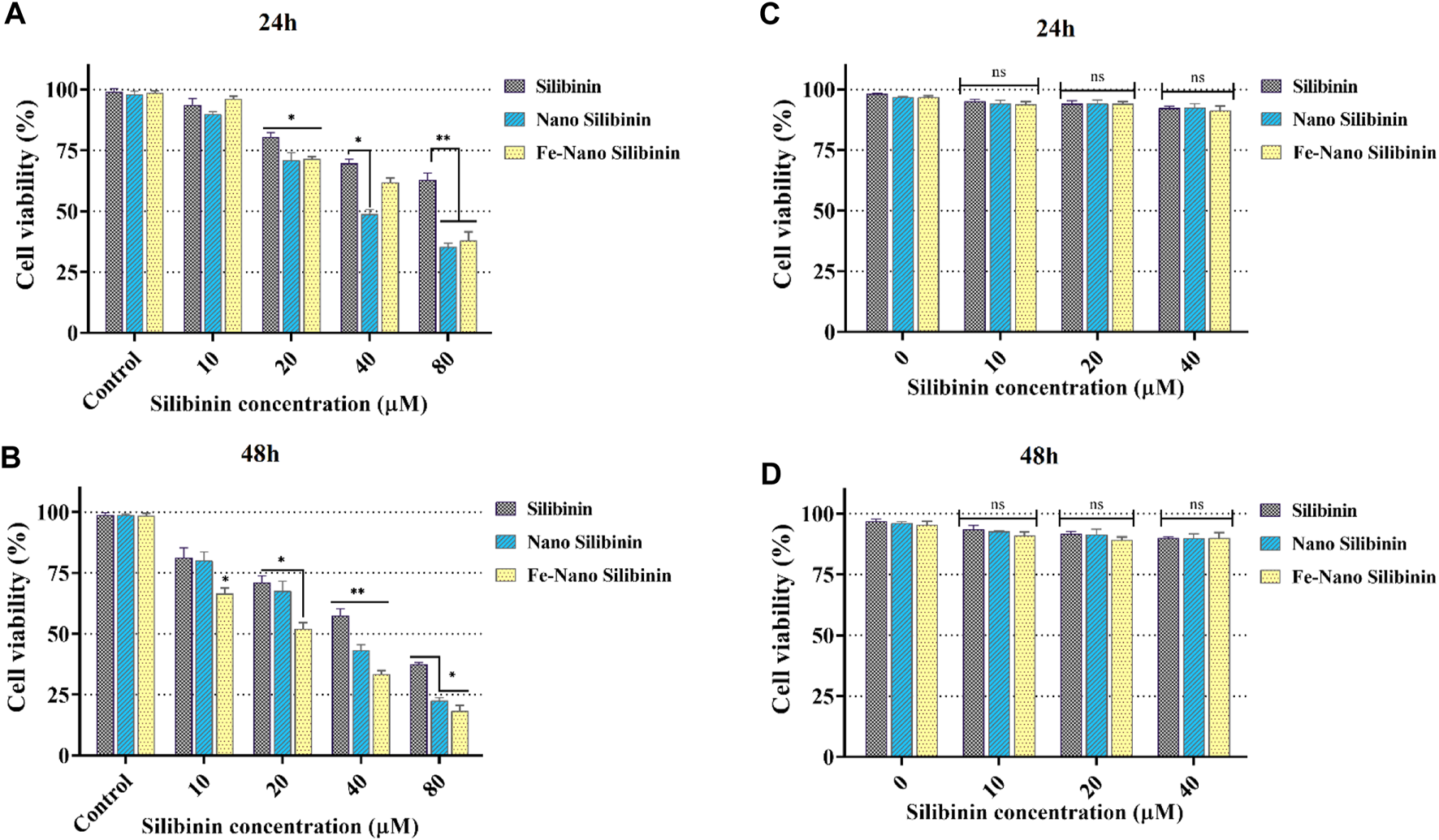 FIGURE 6. MTT assay results revealed in vitro cytotoxicity of blank NIOs (control), Silibinin, Silibinin loaded NIOs, Silibinin loaded magnetic NIOs NPs on HT-29 colon cancer cells [(A) and (B)], and HEK-293 normal cell line [(C) and (D)] after 24 h and 48 h incubation time. Encapsulation of silibinin in MNNPs improved its cytotoxic effect on HT-29 colon cancer cells, while it had no significant cytotoxic effect on HEK-293 cells. Data are presented as mean ± SD of three independent experiments. Error bars show standard variations and significance is indicated by *p < 0.05, **p < 0.01 and ***p < 0.001 compared to the control group.
