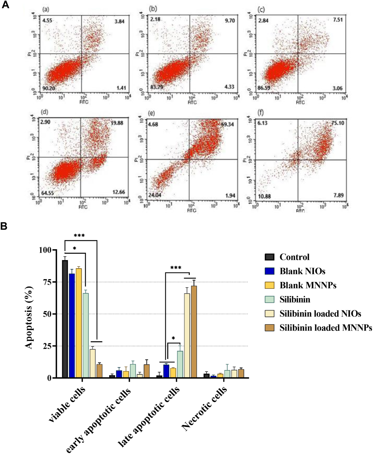 FIGURE 7. (A). Apoptosis analysis on HT-29 cell line under treatment (a) control, (b) blank NIOs, (c) blank MNNPs, (d) Silibinin, (e) Silibinin loaded NIOs, (f) Silibinin loaded MNNPs. (B). HT-29 cells treated with pure silibinin and niosomal complexes were evaluated after 48 h by FITC-labeled annexin V/PI flow cytometry. The obtained results confirmed that NIOs loaded with the silibinin significantly increase the apoptosis of HT-29 cells, which emphasizes the increase in the absorption of drugs from NIOs by the cells. This result is consistent with the MTT results. Data were analyzed using Flowjo-V10 analysis software and shown as mean ± SD of three independent experiments. Significance is indicated by *p < 0.05, **p < 0.01 and ***p < 0.001 compared to the control group.