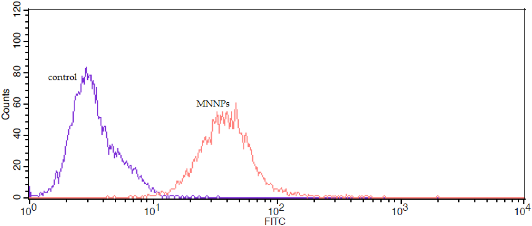 FIGURE 8. The flow cytometry analysis of uptake of FITC-labeled magnetic nisome nanoparticles (MNNPs) by HT-29 cells.