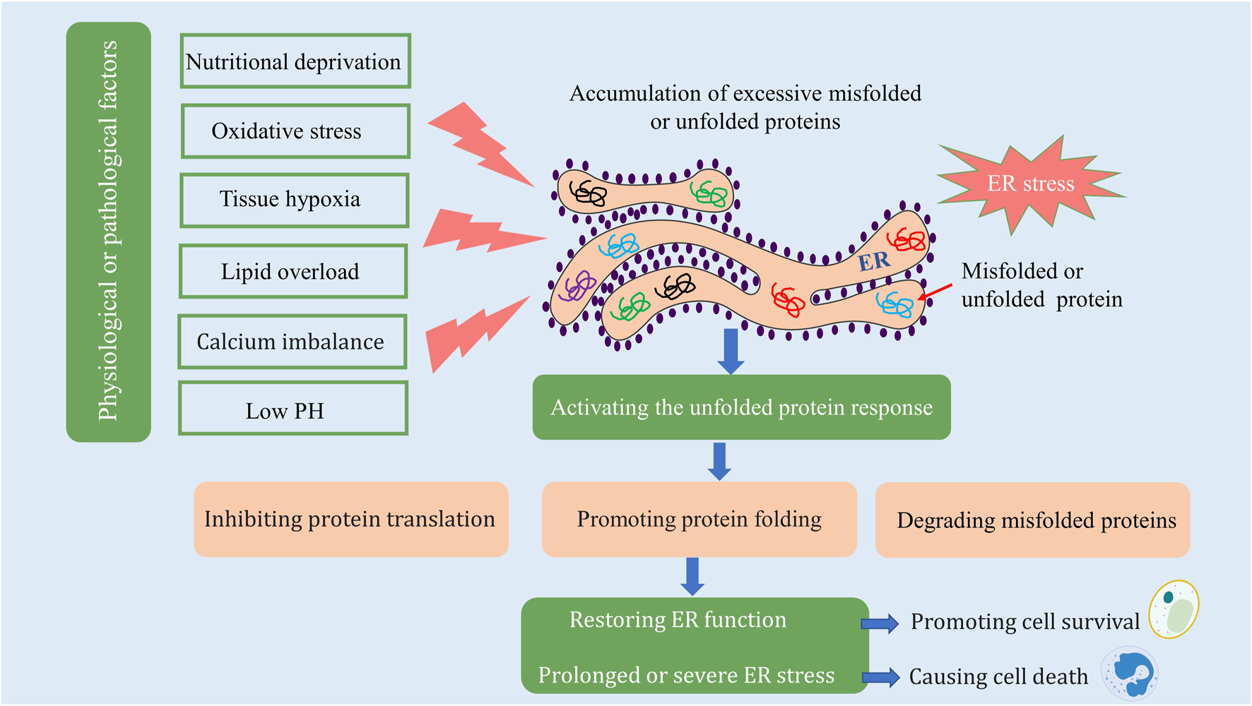 The ER is an intracellular organelle found in eukaryotic cells, critical for various functions including protein synthesis and folding, lipid biosynthesis, calcium storage, and detoxification processes (Schwarz and Blower, 2016; Huang et al., 2022). The ER is highly sensitive to environmental alterations, and several physiological or pathological conditions can adversely affect its function. Factors such as nutritional deprivation, oxidative stress, tissue hypoxia, lipid overload, calcium imbalance, and low pH can precipitate the accumulation of unfolded or misfolded proteins within the ER, thereby impairing its function and precipitating what is known as ER stress. The manifestation of ER stress can be categorized into three primary responses: the unfolded protein response (UPR), the ER overload response, and the sterol regulatory element-binding protein response. The first two responses arise from disturbances in protein processing, whereas the latter response is a consequence of cholesterol depletion synthesized at the endoplasmic reticulum’s surface. The UPR, the most extensively studied of these responses, plays a pivotal role in mitigating damage induced by ER stress. In response to ER stress, cells initiate the UPR to alleviate damage, including inhibition of protein translation, enhancement of protein folding capabilities, and degradation of misfolded proteins via ER-associated degradation (Engin and Hotamisligil, 2010). This response mechanism assists in restoring ER homeostasis and promotes cell survival. However, in cases where ER stress is either too severe or sustained for extended periods, the UPR may paradoxically activate programmed cell death (Engin and Hotamisligil, 2010; So, 2018) (Figure 1).