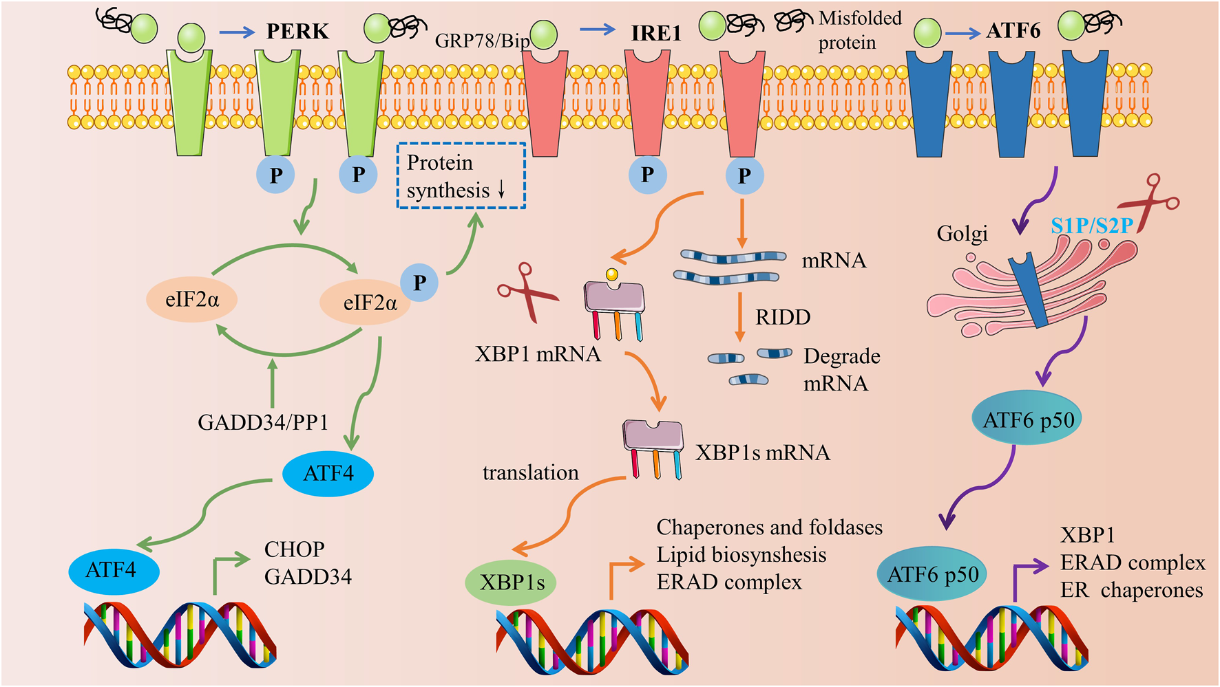 UPR is an adaptive cellular mechanism governed by three ER transmembrane proteins: protein kinase R (PRK)-like ER kinase (PERK), inositol-requiring enzyme 1 (IRE1), and activating transcription factor 6 (ATF6). Under standard physiological conditions, these transmembrane proteins bind to GRP78, thereby maintaining an inactive state. However, when ER stress is induced, an accumulation of unfolded or misfolded proteins results in the binding to GRP78, causing the disassociation of GRP78 from PERK, IRE1, and ATF6. This disassociation instigates the subsequent induction of downstream signaling pathways (Figure 2).
