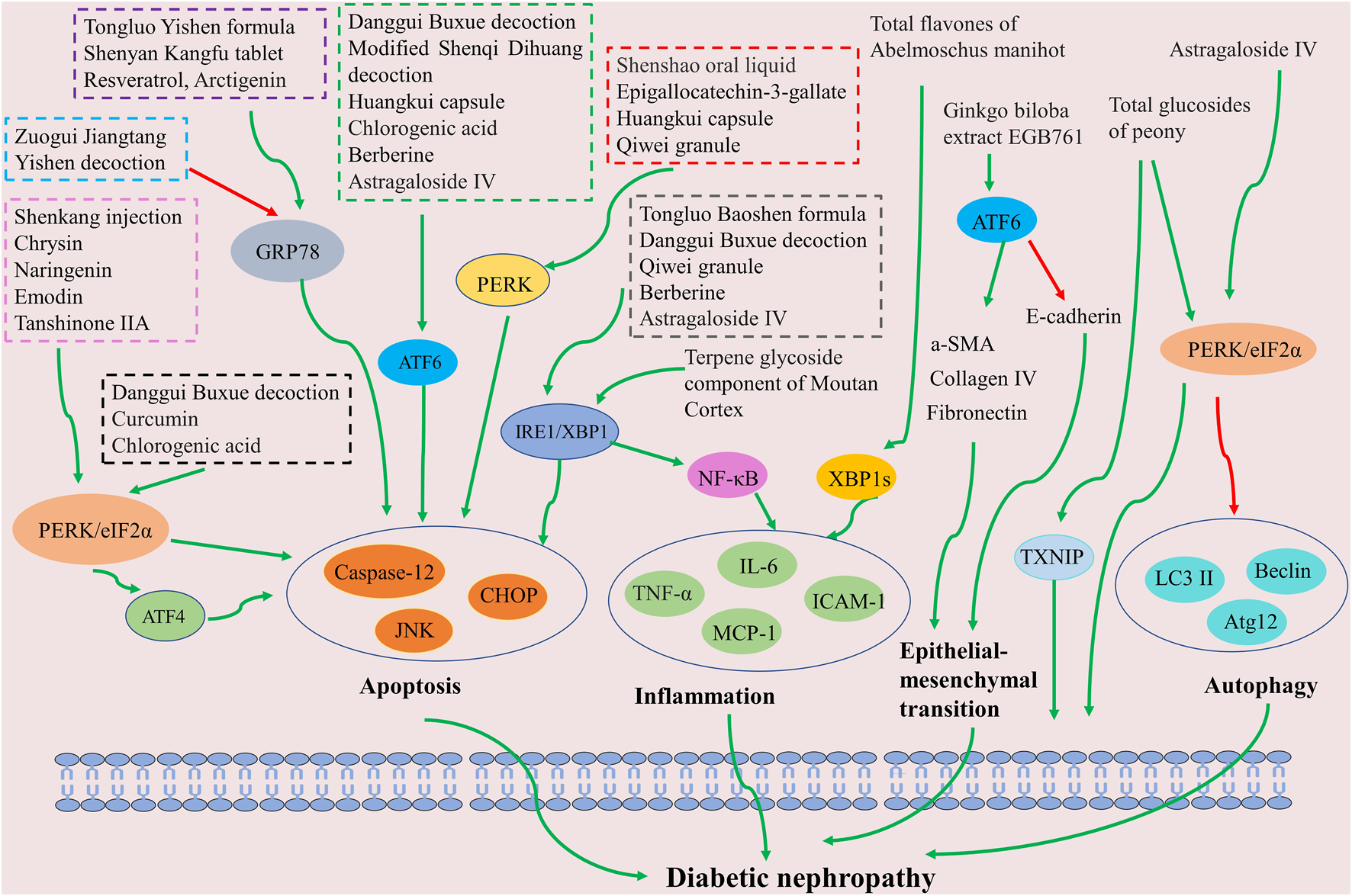 | Danggui Buxue decoction | SD rats treated with high sugar, high-fat diet and 60mg/kg STZ Glomerular mesangial cells cultured with high glucose | Lowered blood glucose | GRP78↓, PERK↓, eIF2α↓, p-IRE1α↓, ATF6↓, CHOP↓, Caspase-3↓, Caspase-12↓, p-JNK↓ | Zhang et al. (2015) |