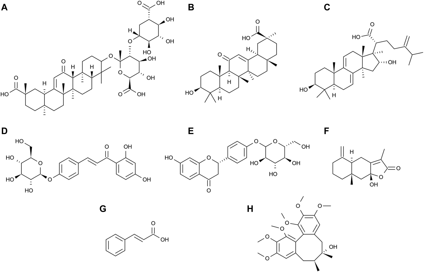 Chemical structures of glycyrrhizic acid (A), glycyrrhetinic acid (B), dehydrotumulosic acid (C), isoliquiritin (D), liquiritin (E), atractylenolide III (F), cinnamic acid (G), and schisandrin (IS) (H).