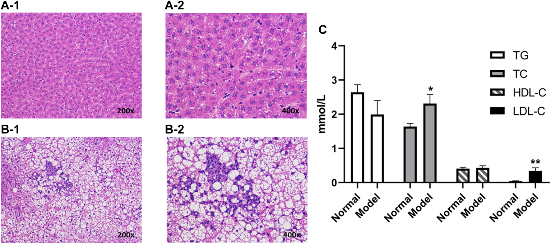 Liver histopathology of rats with and without NAFLD. Representative histopathology of liver sections from control (non-NAFLD) rats: (A-1) ×200 magnification and (A-2) ×400 magnification, and from NAFLD rats: (B-1) ×200 magnification and (B-2) ×400 magnification. The serum biochemical indexes of the model group were compared with those from the normal group (C). Liver sections were stained with hematoxylin and eosin prior to microscopy (**p < 0.01 and *p < 0.05, which compared with the control group).