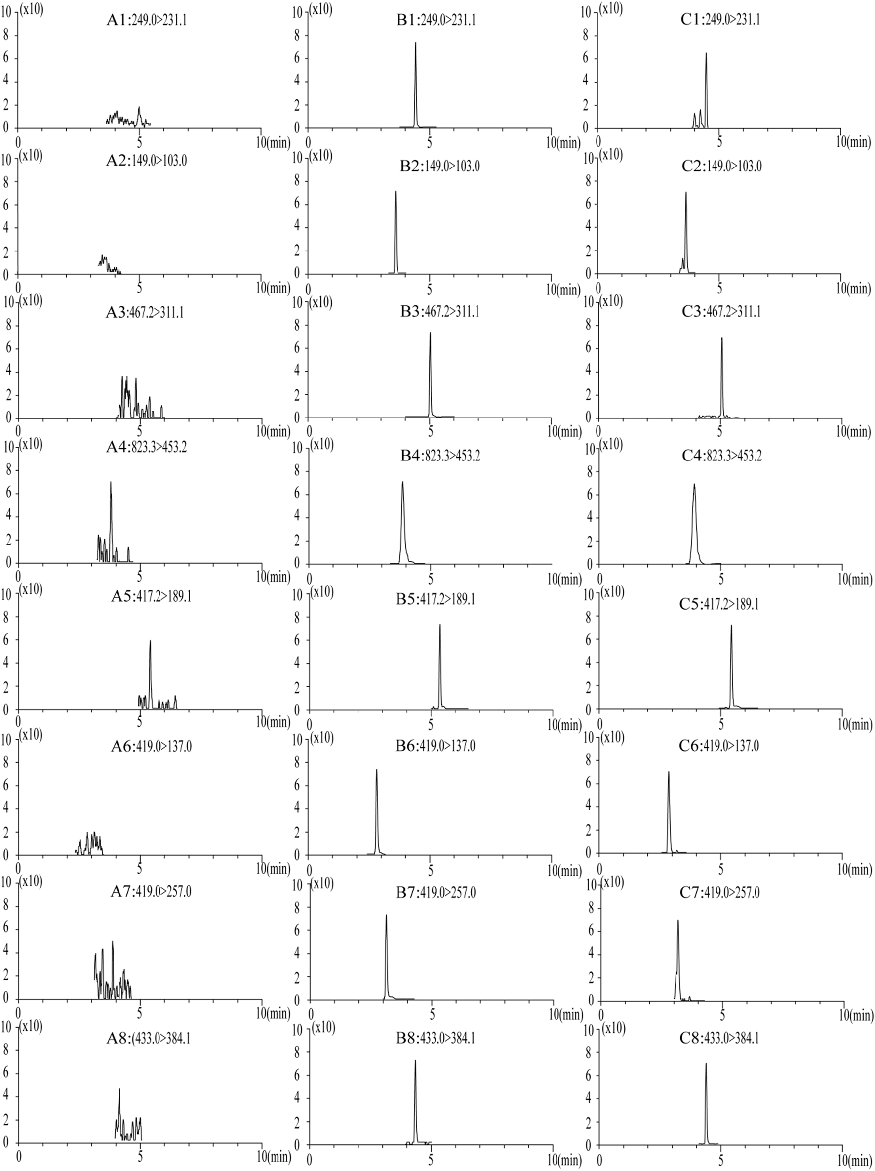 MRM chromatograms of blank plasma samples: (A) blank spiked with combined standard solutions of the seven analytes and IS, (B) rat plasma samples at 4 h after oral administration of LGZGD (C). 1, atractylenolide III; 2, cinnamic acid; 3, dehydrotumulosic acid; 4, glycyrrhizic acid; 5, glycyrrhetinic acid; 6, liquiritin; 7, isoliquiritin; and 8, schisandrin (IS).