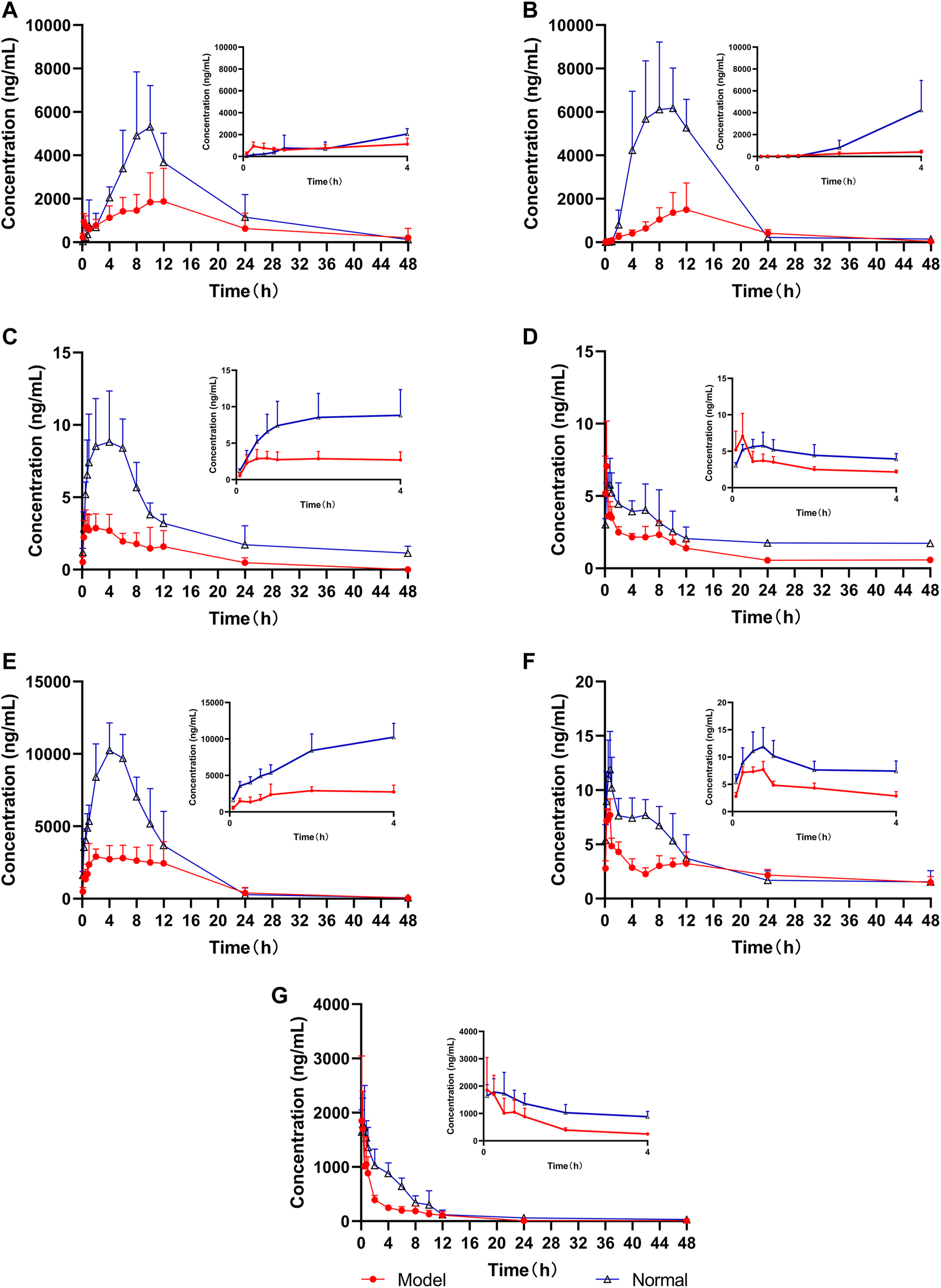 The pharmacokinetic drug behavior is different in normal and NAFLD rats. The pharmacokinetics of rosiglitazone in normal and high-fat diet–induced NAFLD model rats have hereby been reported (Kulkarni et al., 2016). The results have shown that the pharmacokinetics of rosiglitazone in NAFLD mice changed significantly. Compared with healthy mice, the oral clearance rate of rosiglitazone in NAFLD mice was significantly reduced and the average plasma half-life was significantly prolonged. Actually, NAFLD has been reported to be associated with the regulation of metabolic enzymes and transporters (Fisher et al., 2009). The difference in the pharmacokinetics might be related to changes in the expression of transporters in rats. Therefore, studying the changes of metabolic enzymes and transporters in rat liver is of great significance to reveal the pharmacokinetic process in NAFLD rats. On the basis of the previous research by the present researchers (Yi et al., 2018; Ma et al., 2021), UPLC-MS/MS was used to detect the expression levels of metabolic enzyme UGT1A1 and drug transporters NTCP, OATP1A1, OCT1, MATE1, MRP2, MDR1, BSEP, OATP1A2, and OATP1A4 in the liver of rats in the normal and model groups. Up to now, no comparative pharmacokinetics of these active compounds has been reported in normal and NAFLD rats after LGZGD administration. Therefore, an accurate and reliable UPLC-MS/MS method is hereby proposed for the simultaneous determination of seven components in the plasma of normal and NAFLD rats after LGZGD administration. The results showed significant differences in pharmacokinetic characteristics between the normal and NAFLD groups. The method was fully validated and applied in a comparative pharmacokinetic study. Overall, the results can provide useful information for clinical application.